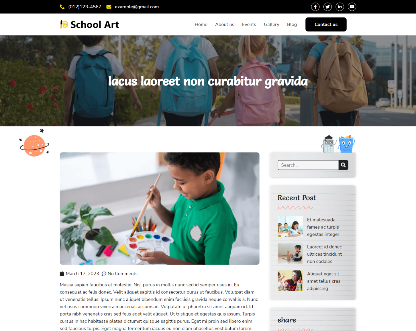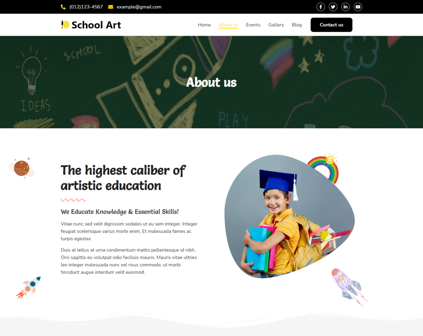 School Art - Nursery and Drawing School Web Elementor Template Kit is for art and painting classes. It's also helpful for schools and children play house to school. In this web template kit, you get a modern, funny, and amazing design. School Art has 8+ creative and emphasis page designs with 404 error and a coming soon page.