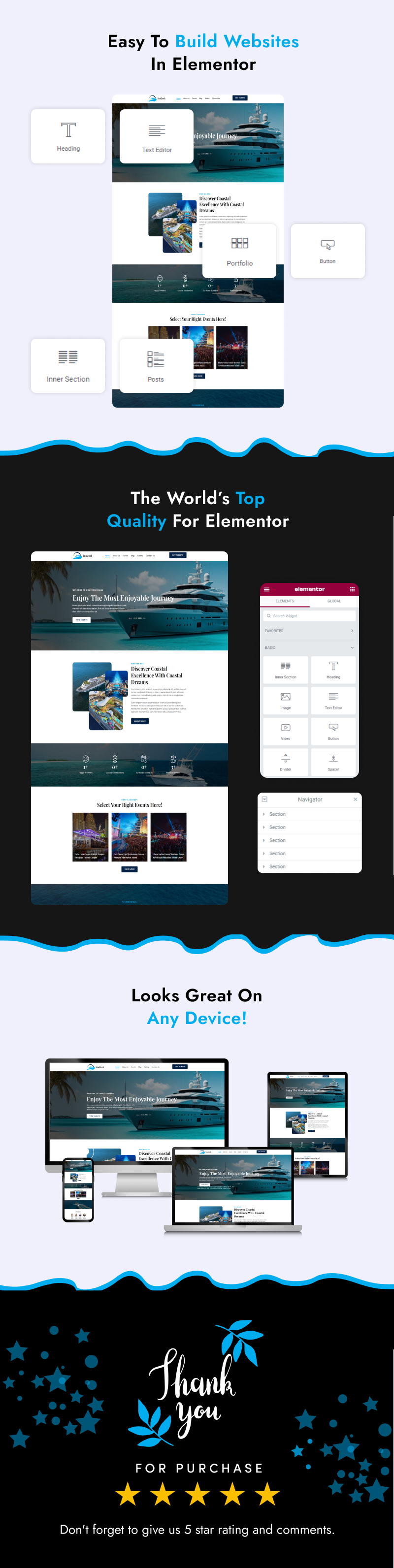 SeaDeck - Cruise Ship Culture and DJ Events Elementor Template Kit is a premium and modern Elementor Template Kit designed especially for cruise ship websites, onboard events, and DJ parties at sea. Whether you're promoting luxury sea voyages, live DJ performances, or showcasing the vibrant cruise ship culture, this website Elementor kit delivers a sleek, responsive, and visually stunning layout that captures attention instantly. Perfect for cruise lines, travel businesses, or event organizers, SeaDeck helps you build a professional website without writing a single line of code.