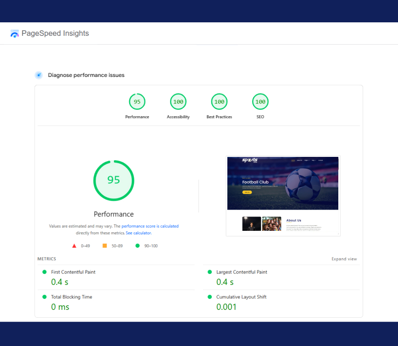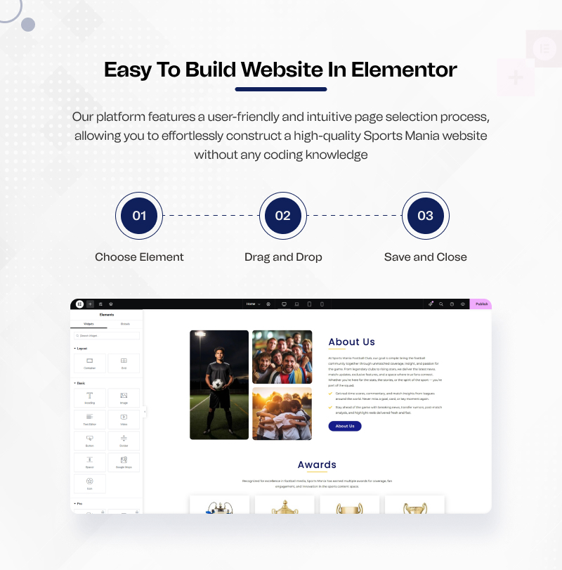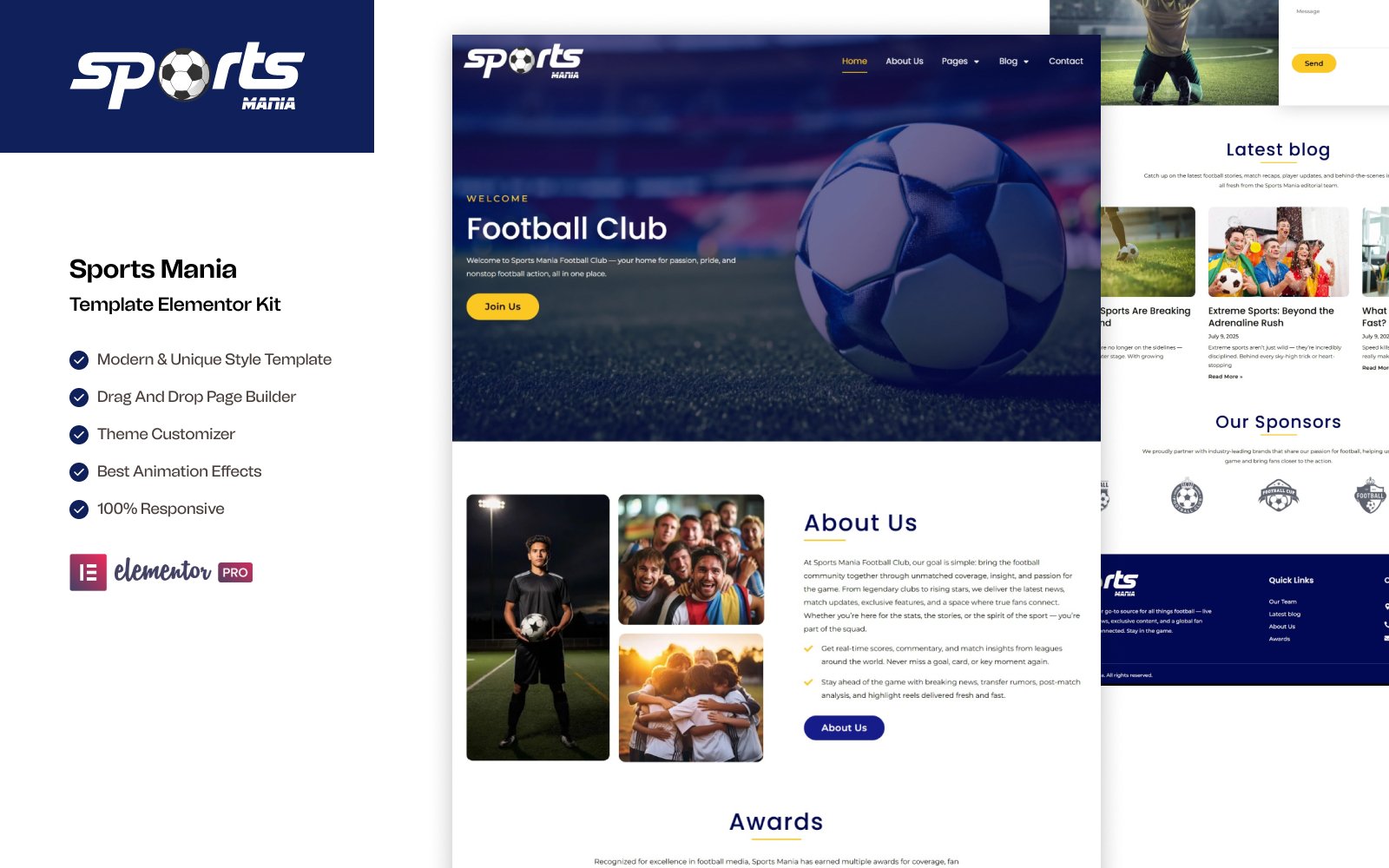 Sports Mania is the latest and perfect Elementor Template Kit for anyone looking to build a sporty and classy website for a Football Club 🥅, Football School 🎓, Football Academy 🏫, or any kind of sports team 🏃. This modern and carefully crafted template kit features a 100% responsive layout 📱 and is retina ready for high-quality visuals.