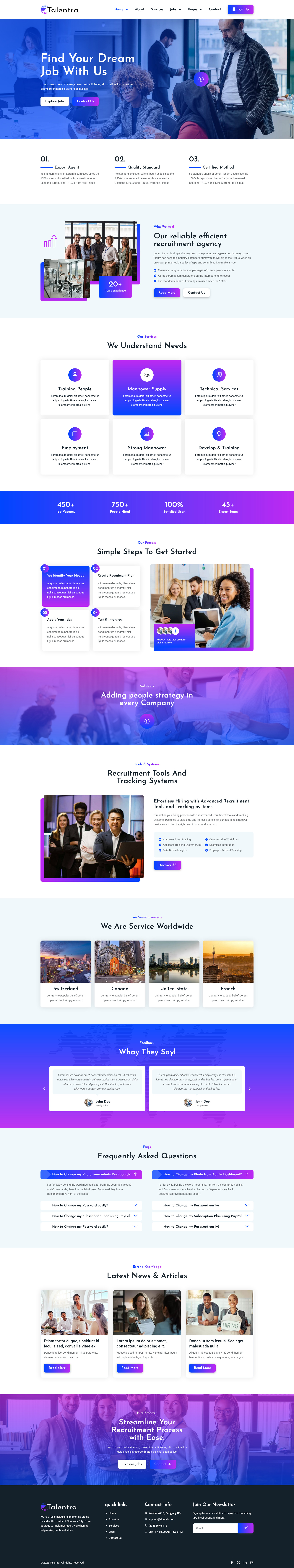 Talentra – Recruitment Job Agency is an Elementor Kit designed specifically for job portals, job listings, HR consultancy, talent acquisition, and all types of recruitment businesses. Talentra offers a complete template package to establish your recruitment services website seamlessly. It features a modern and professional design with a fully responsive layout, making customization effortless with Elementor—no coding required!