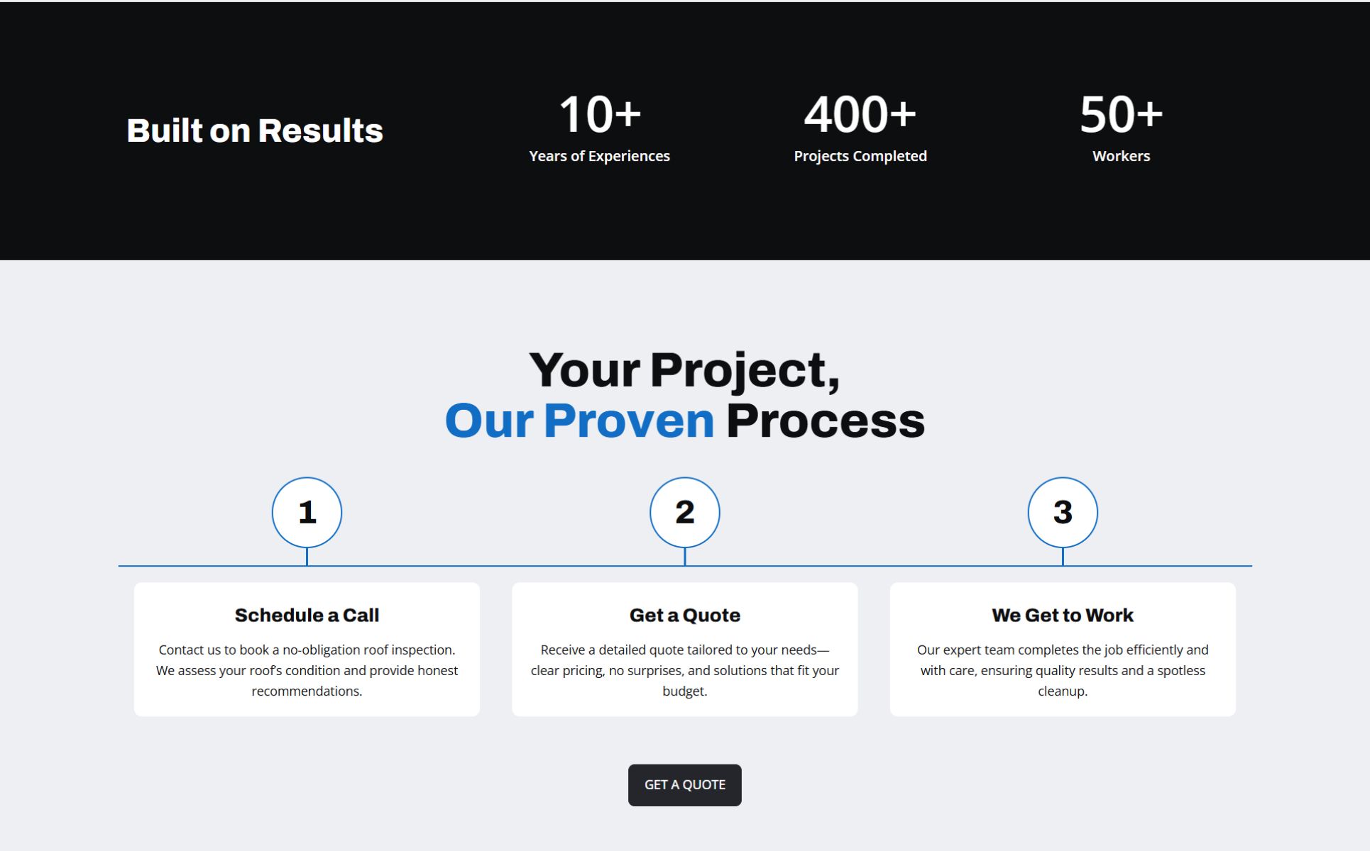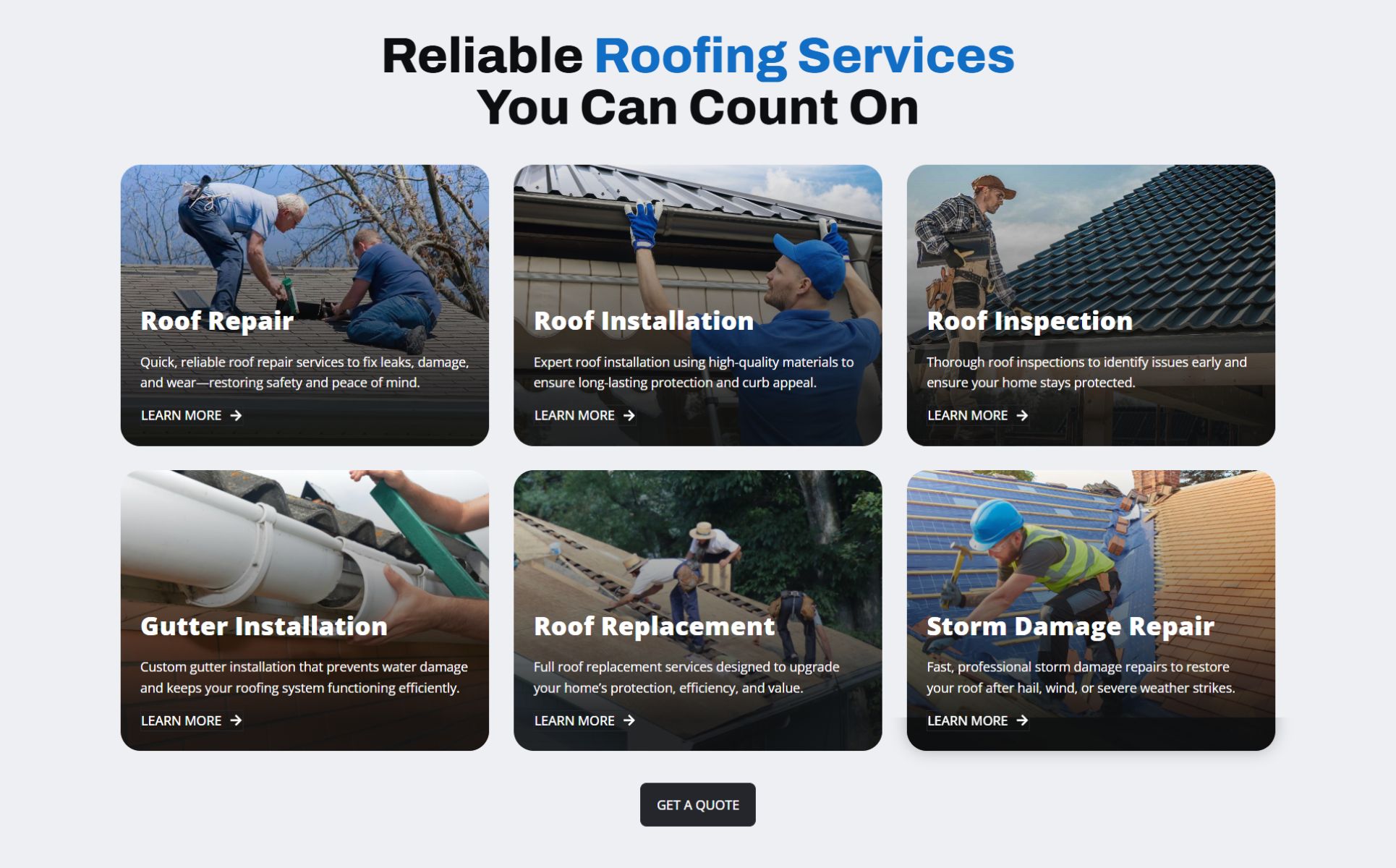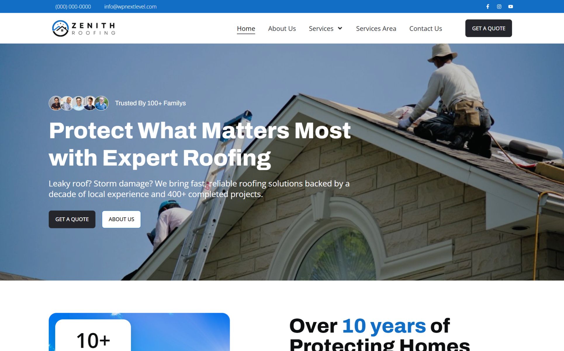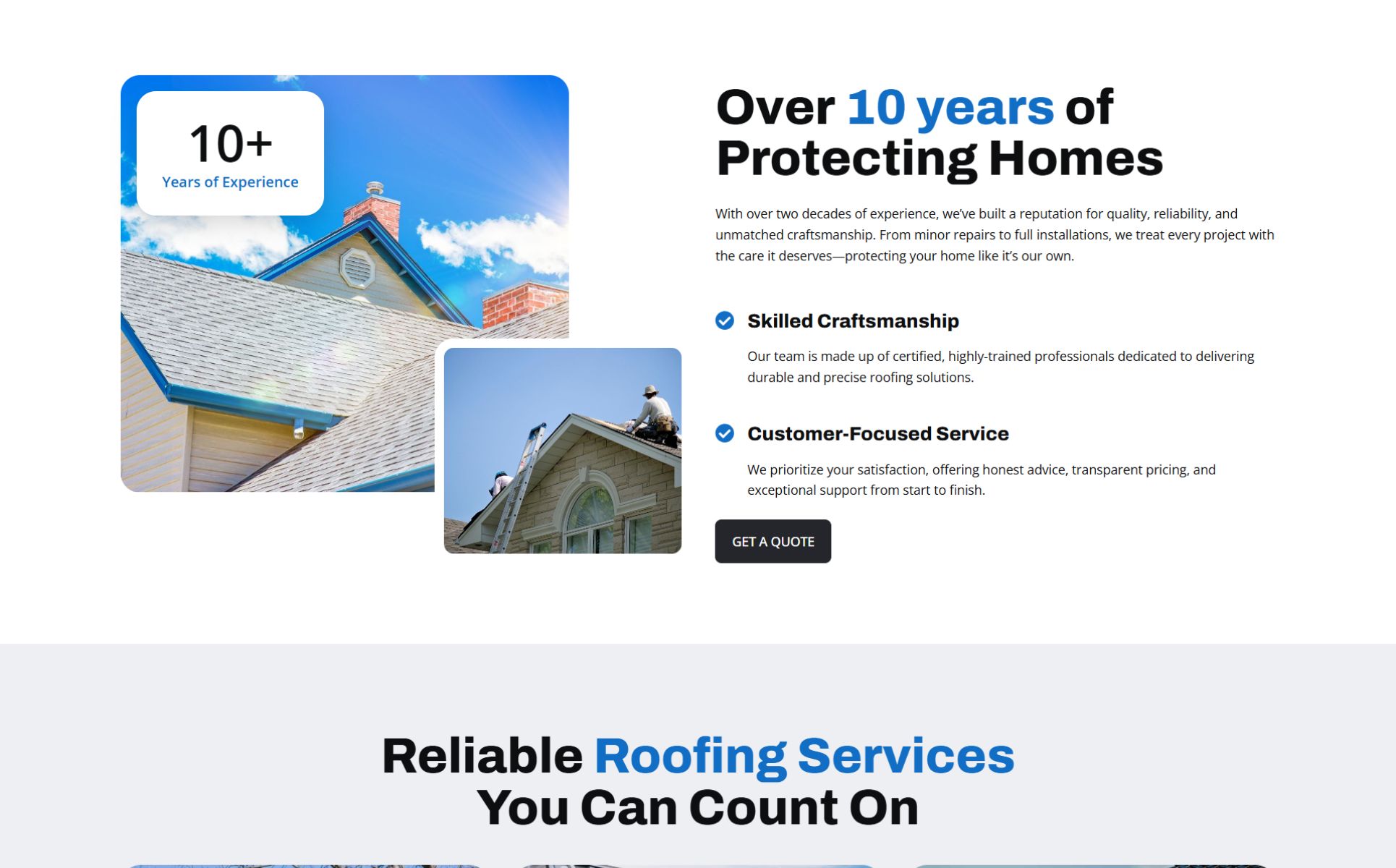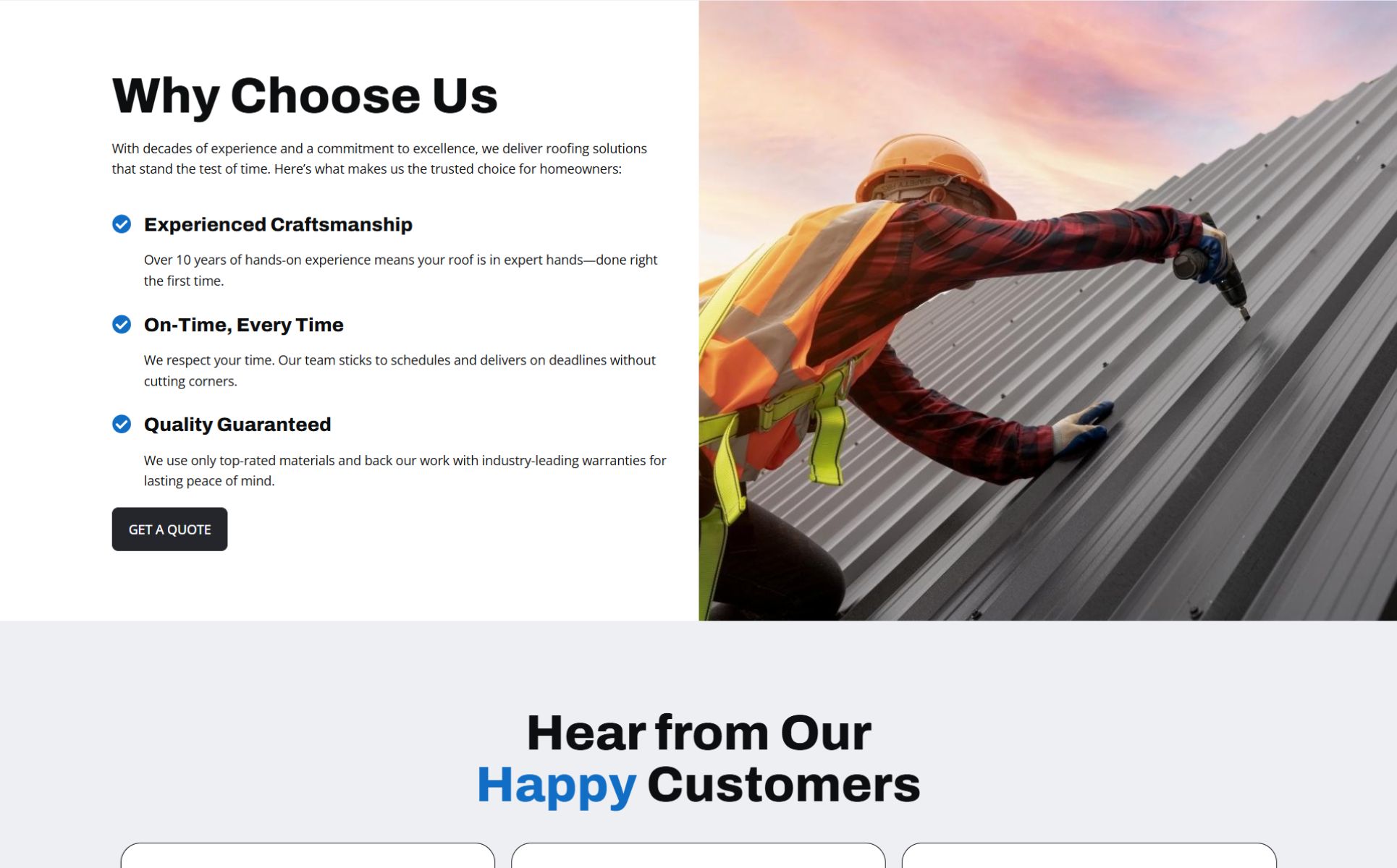 - Clean, bold design tailored for roofing businesses