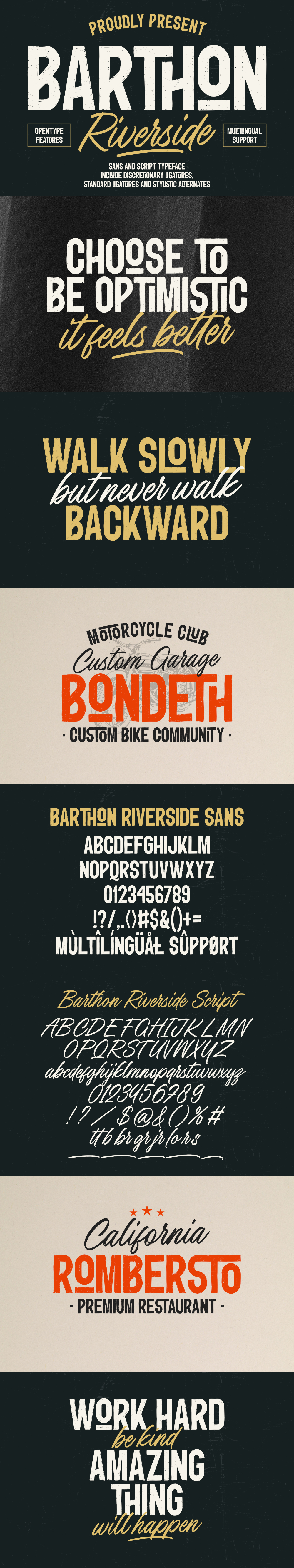 Barthon Riverside is a stylish and versatile font duo featuring sans and flowing script typeface. This perfectly complementary pair combines modern and stylish , offering endless possibilities for creative projects. Whether used together or independently, Barthon Riverside strikes a perfect balance between bold sophistication and delicate charm.