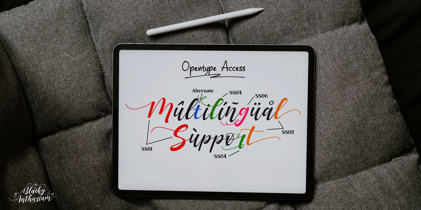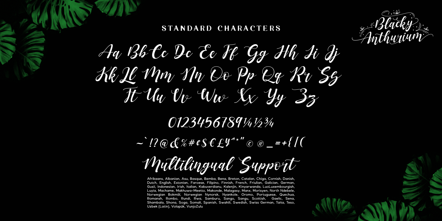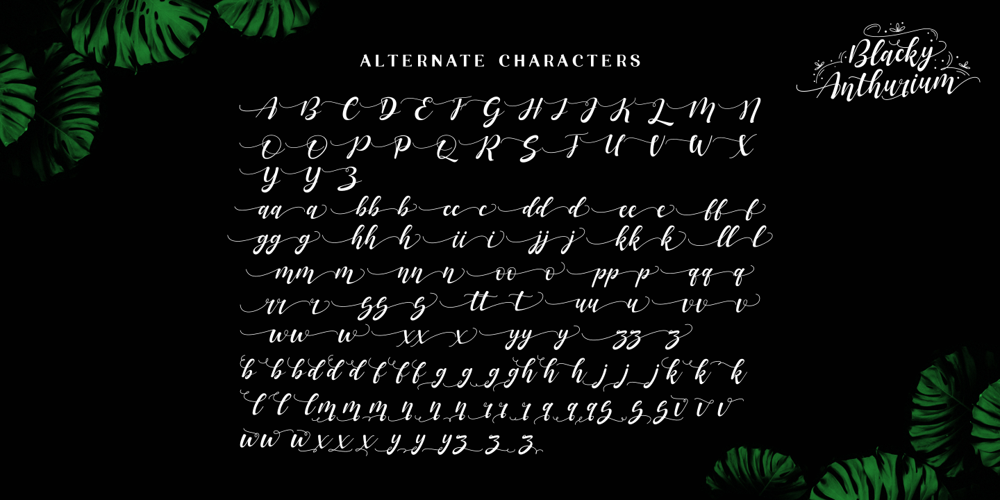 Proudly present a bouncy pretty script called Blacky Anthurium. Every strike of the shape brings the vibes of pretty and elegant. Blacky Anthurium font comes with a lot of alternates, every letter uppercase and lowercase has the alternate characters from SS01-SS06. For more outstanding looks, this font comes with doodles and ornaments characters too so you can mix and match it for outstanding looks. Blacky Anthurium font is perfect for logo font, branding, greeting card, cut files for quotes, silhouette font design, monogram font, etc.