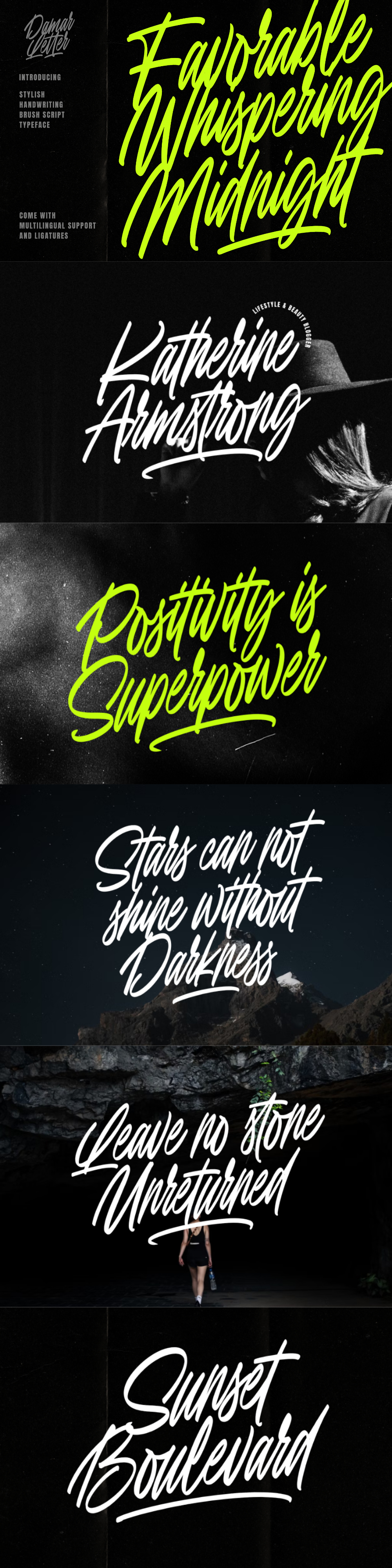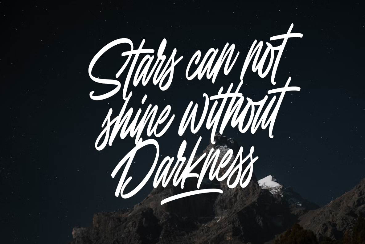 Favorable Whispering Midnight is a graceful and atmospheric brush script typeface that combines the spontaneity of handwritten notes with the expressive texture of brush strokes. Its smooth, flowing letterforms convey elegance and intimacy, making it perfect for designs that aim to capture a sense of quiet sophistication and understated beauty.