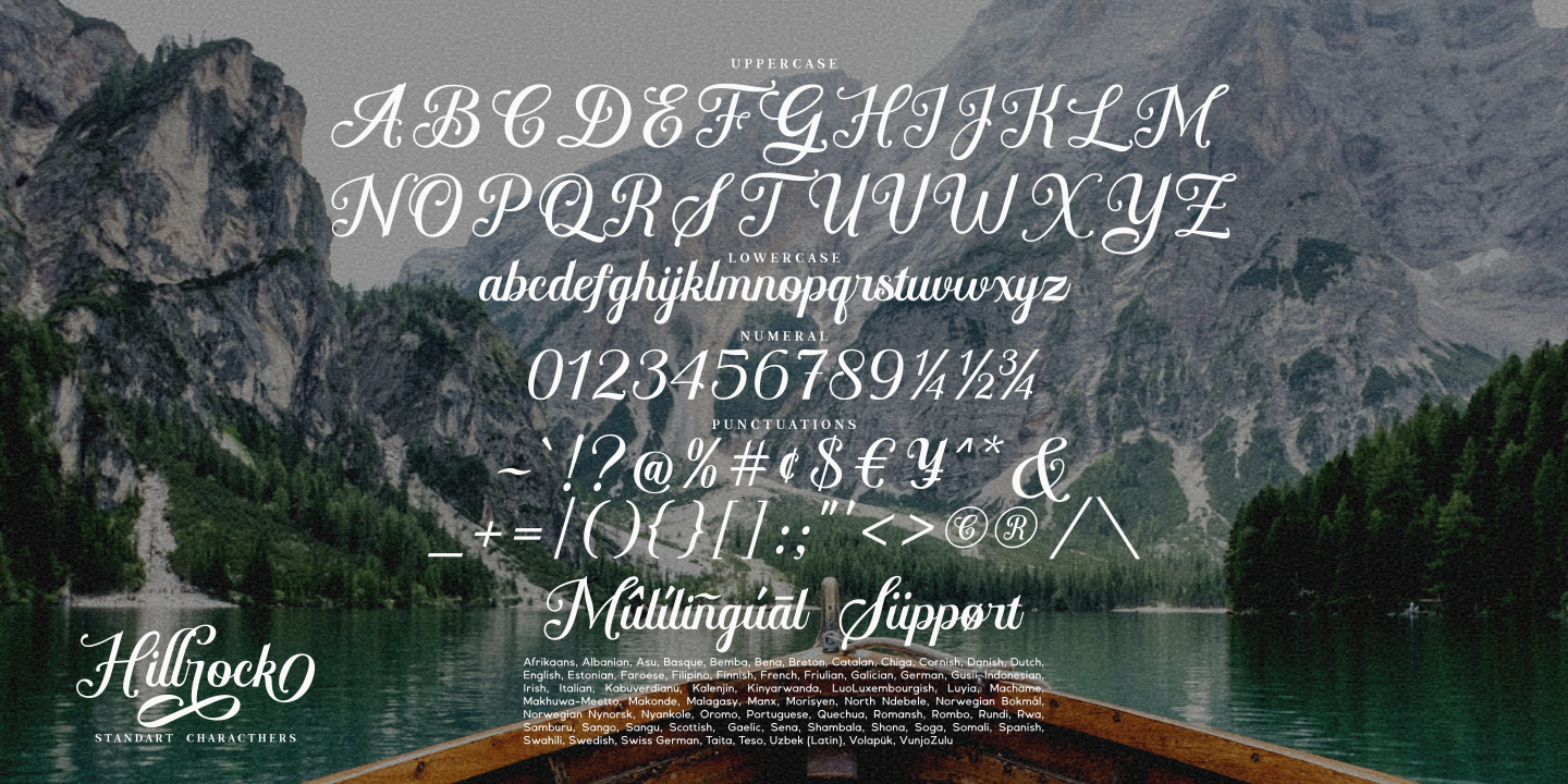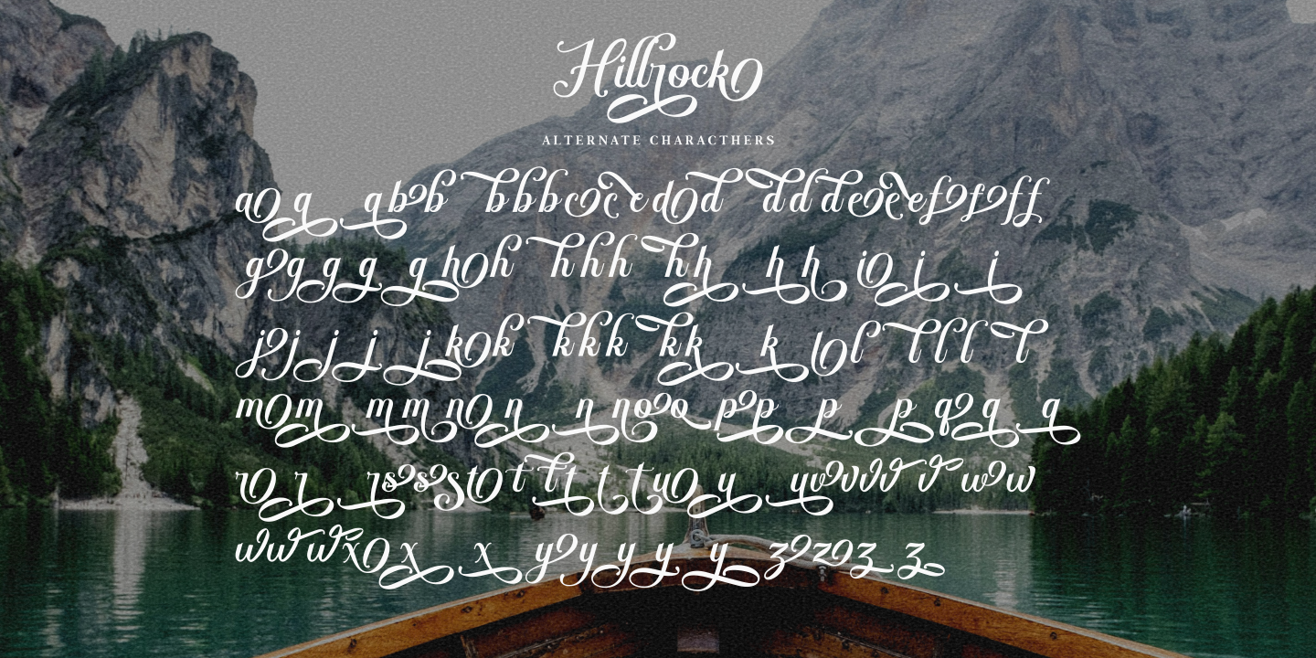 Proudly presenting an elegant script font called Hillrock. This font comes with many alternatives that have more than 3 glyphs for each letter, which you can mix & match to get more outstanding looks. Hillrock font is perfect for logo font, branding, greeting cards, cut files for quotes, silhouette font design, monogram font, etc.