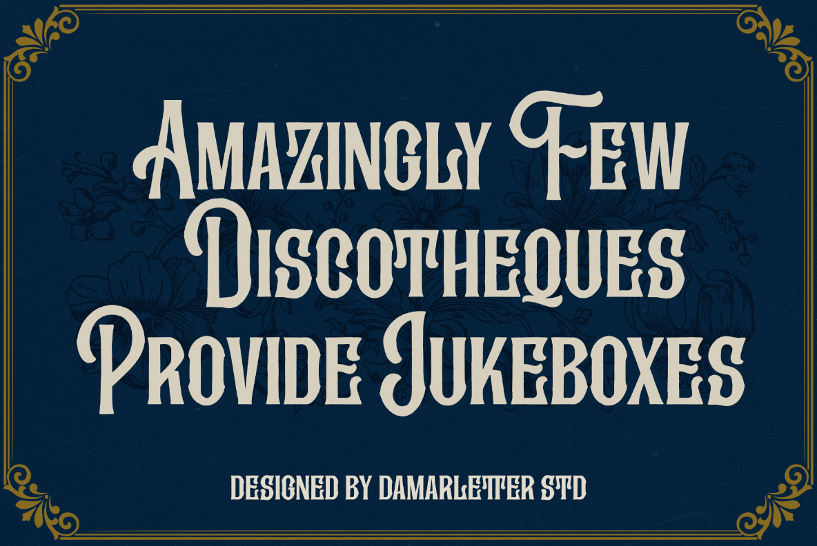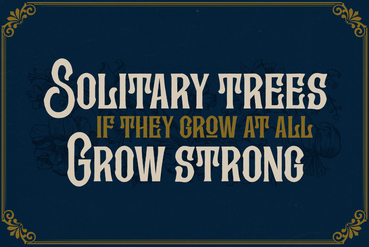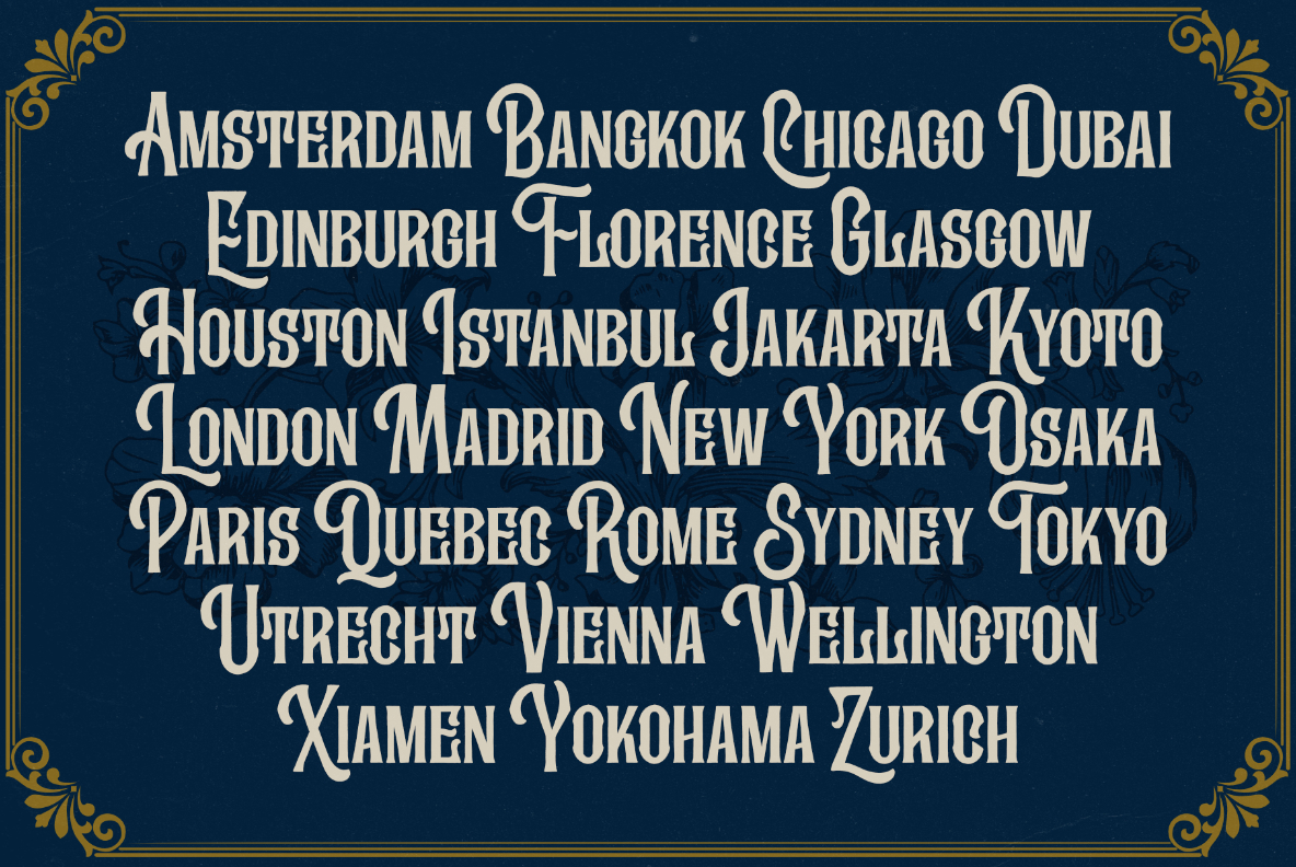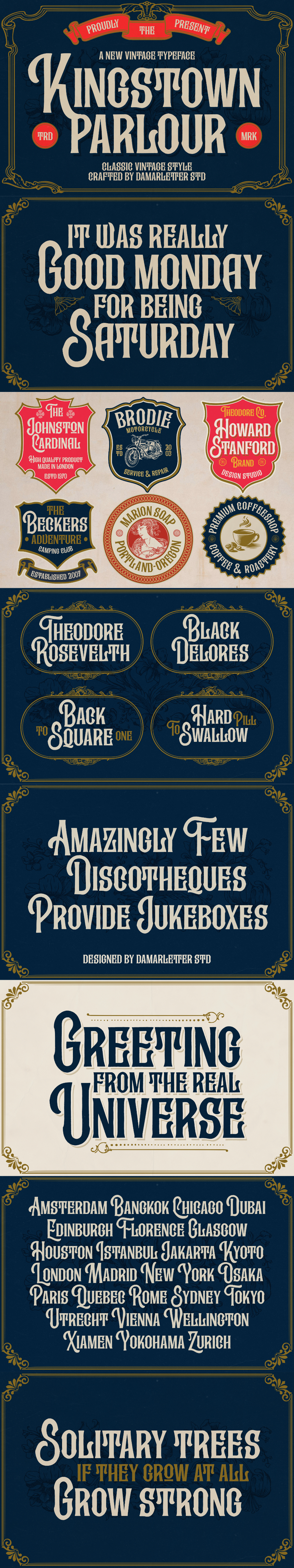 Kingstown Parlour is a vintage typeface that exudes vintage typeface reminiscent of classic vintage signage and typography. This elegant font features intricate details, classic vintage style, creating a dramatic and refined aesthetic. The distressed textures and subtle imperfections add a beautifully aged appearance, making Kingstown Parlour perfect for designs that require a touch of classic elegance and refinement.