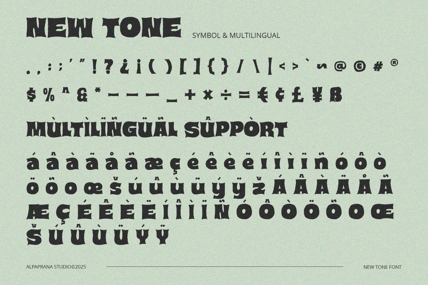New Tone is rough display font with classic feels. It will be perfectly used for Branding, Logo Design, Lettering, Logotype, Clothing, Poster, magazine, packaging, posters, shopping bags, t-shirts, book covers, photography, special events and other design project.