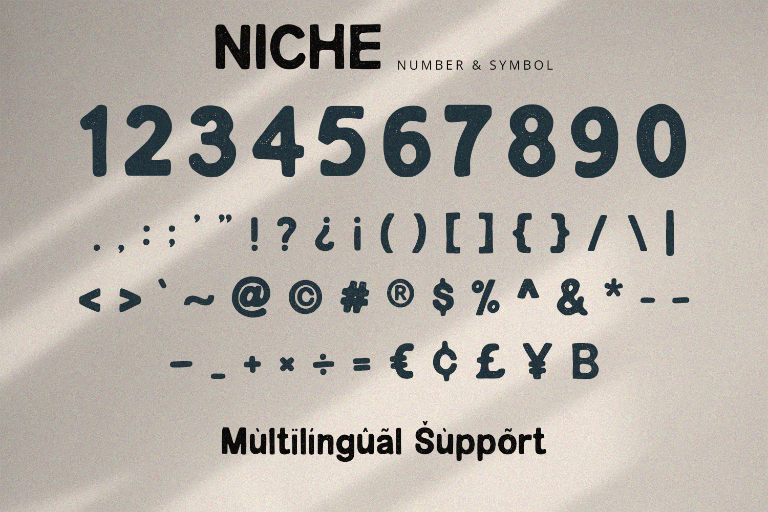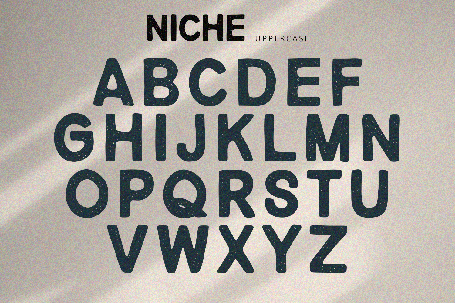 Niche is a rough display font with unique and classic feels. It will be perfectly used for Branding, Logo Design, Lettering, Logotype, Clothing, Poster, magazine, packaging, posters, shopping bags, t-shirts, book covers, photography, special events and other design project.