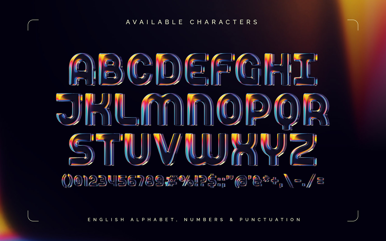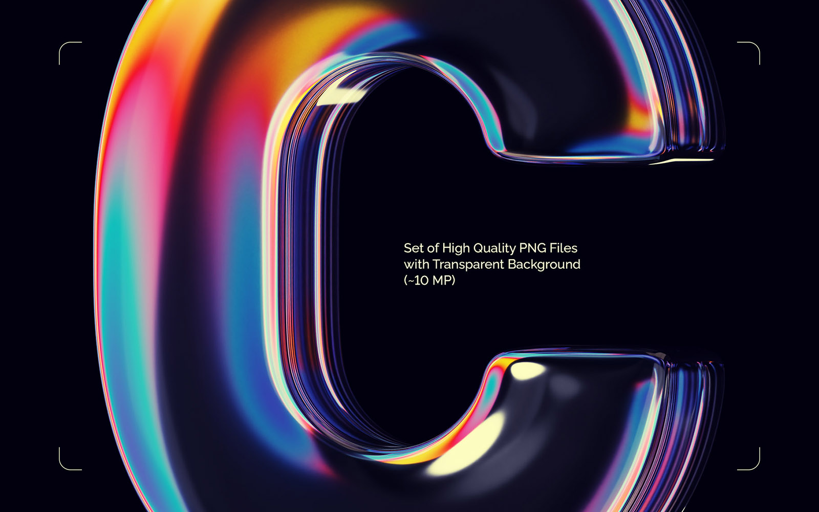 Introducing Refraction Ray, a colorful, creative font set. This 3D font has smooth, rounded letters with a colorful abstract glass texture that reflects light in subtle ways.