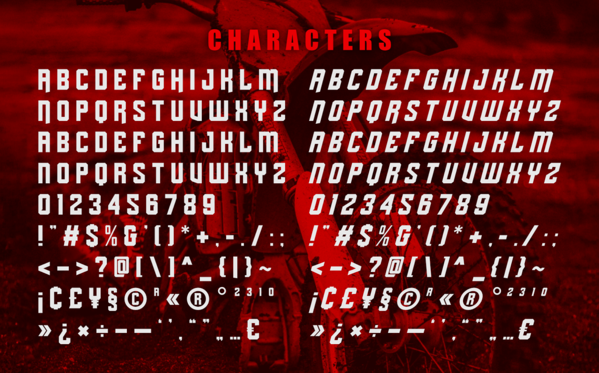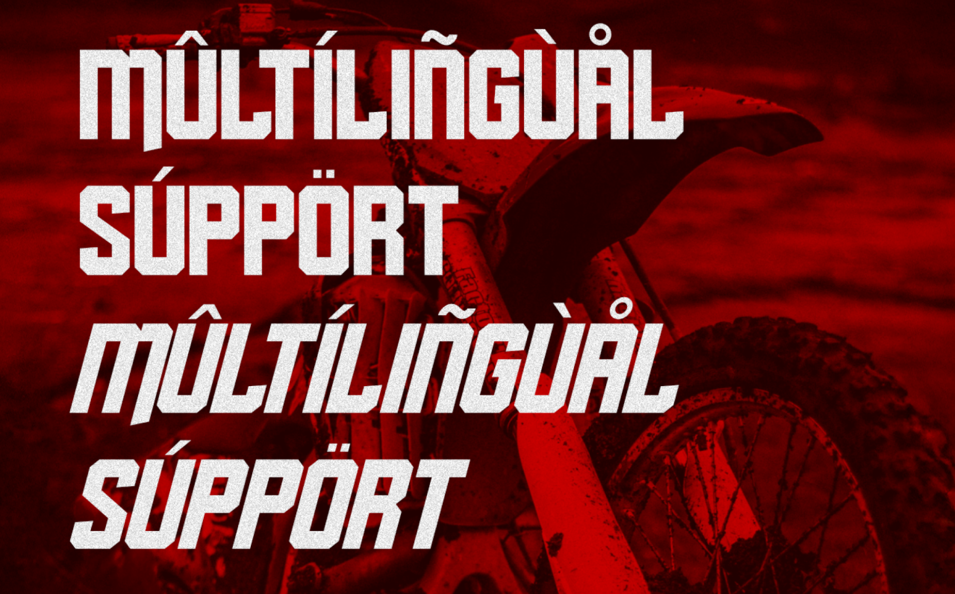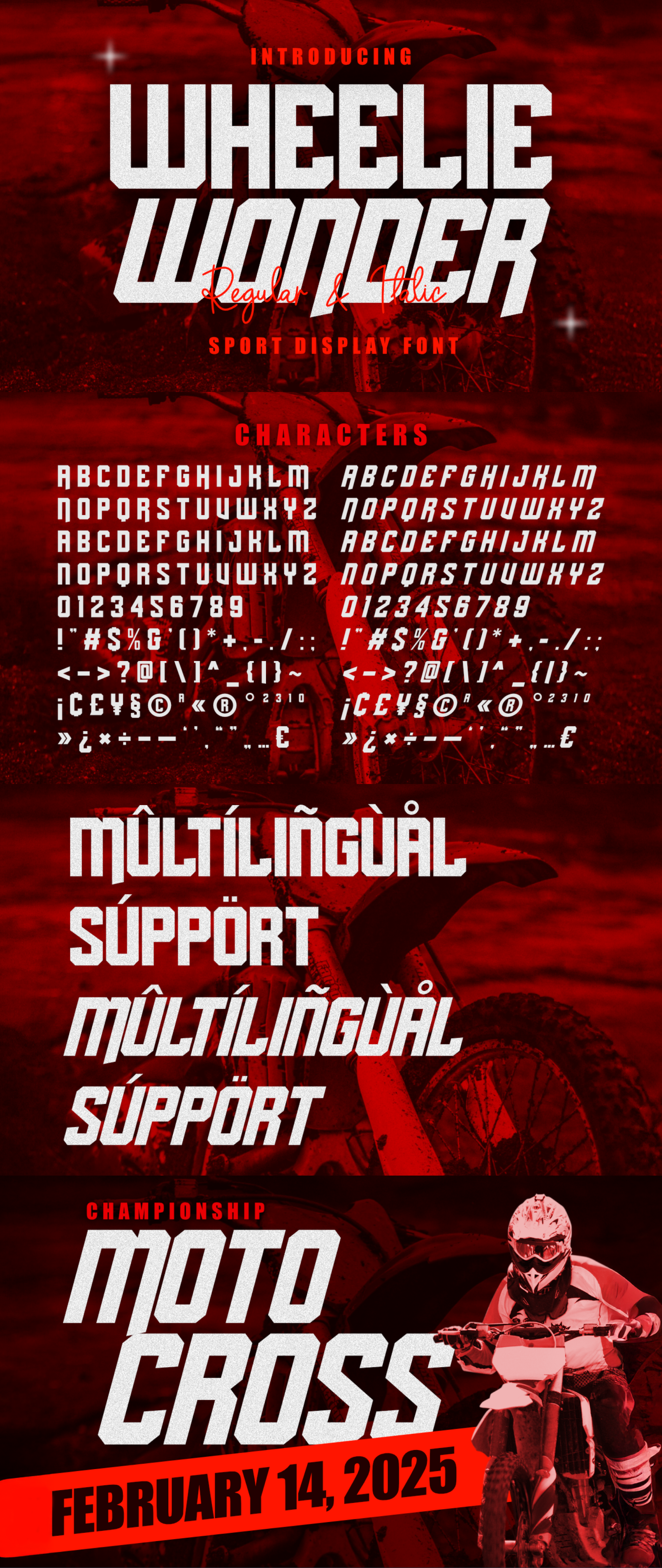The Regular style offers clean, powerful shapes with a confident stance, while the Italic style injects a sense of motion and speed — ideal for designs that need to feel fast and competitive. Whether you’re crafting sports merchandise, team branding, or powerful poster titles, Wheelie Wonder delivers a winning typographic statement every time.