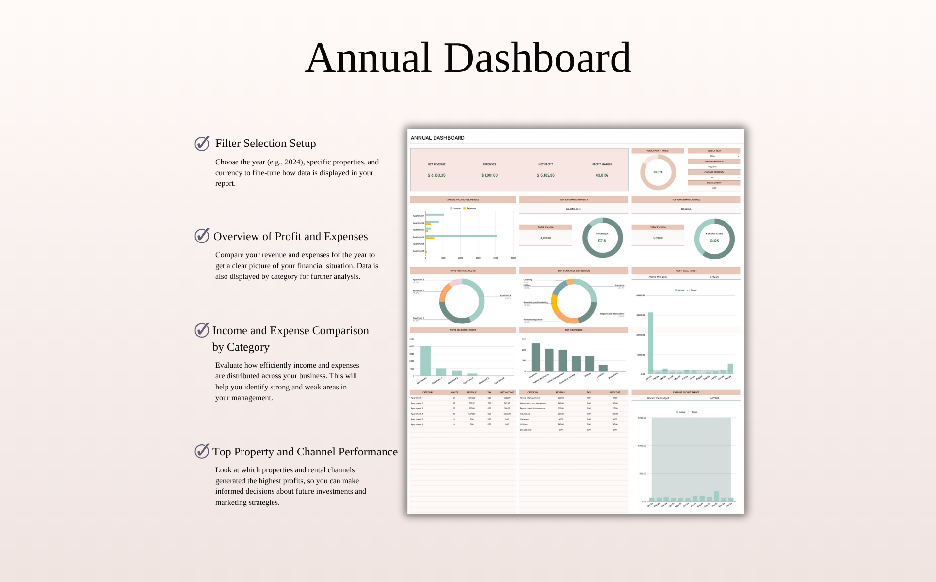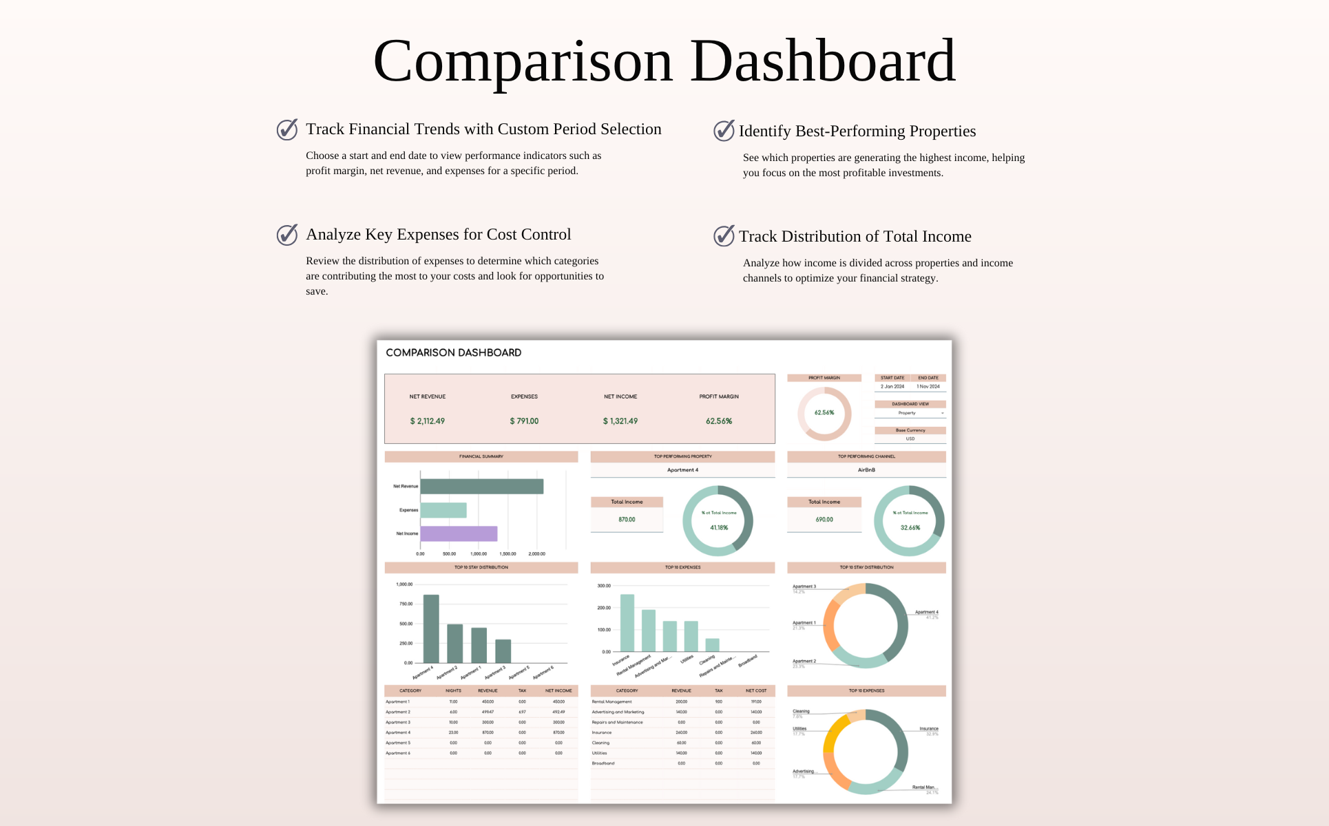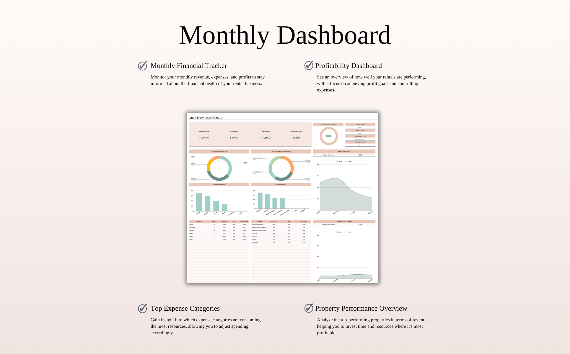 Ideal for Airbnb hosts and short-term rental managers using Booking.com, VRBO, HomeAway, and similar platforms, this spreadsheet helps you stay in full control of your finances and property performance. Manage bookings, income, and expenses across multiple listings with ease — just paste your transaction data, and the template handles the rest through automated calculations and smart dashboards.