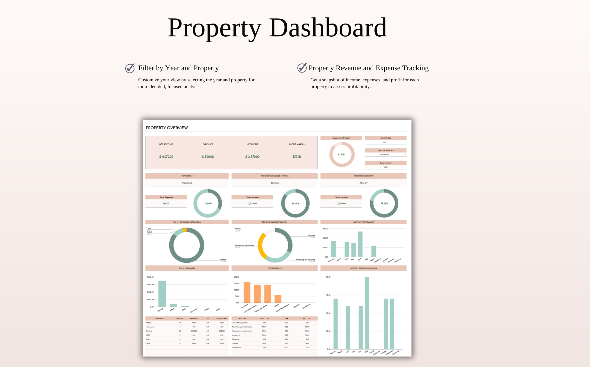 - Property Overview – Filter by year and property, see peak months and top booking sources