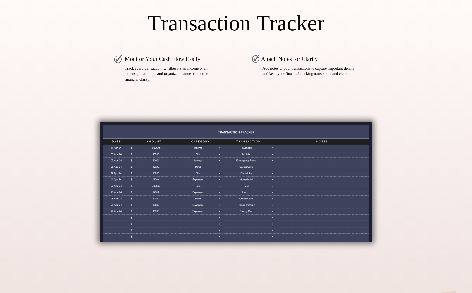 Streamline your budgeting with our modern Dark Theme Budget Planner for Excel and Google Sheets! This minimalistic one-tab spreadsheet offers a smooth and intuitive experience for both new and seasoned users. Begin in just 3 simple steps—enter your transactions, and let the built-in formulas do the rest. Designed with a bold and professional dark theme, this planner is ideal for tracking your finances weekly, bi-weekly, or monthly while staying organized and focused.