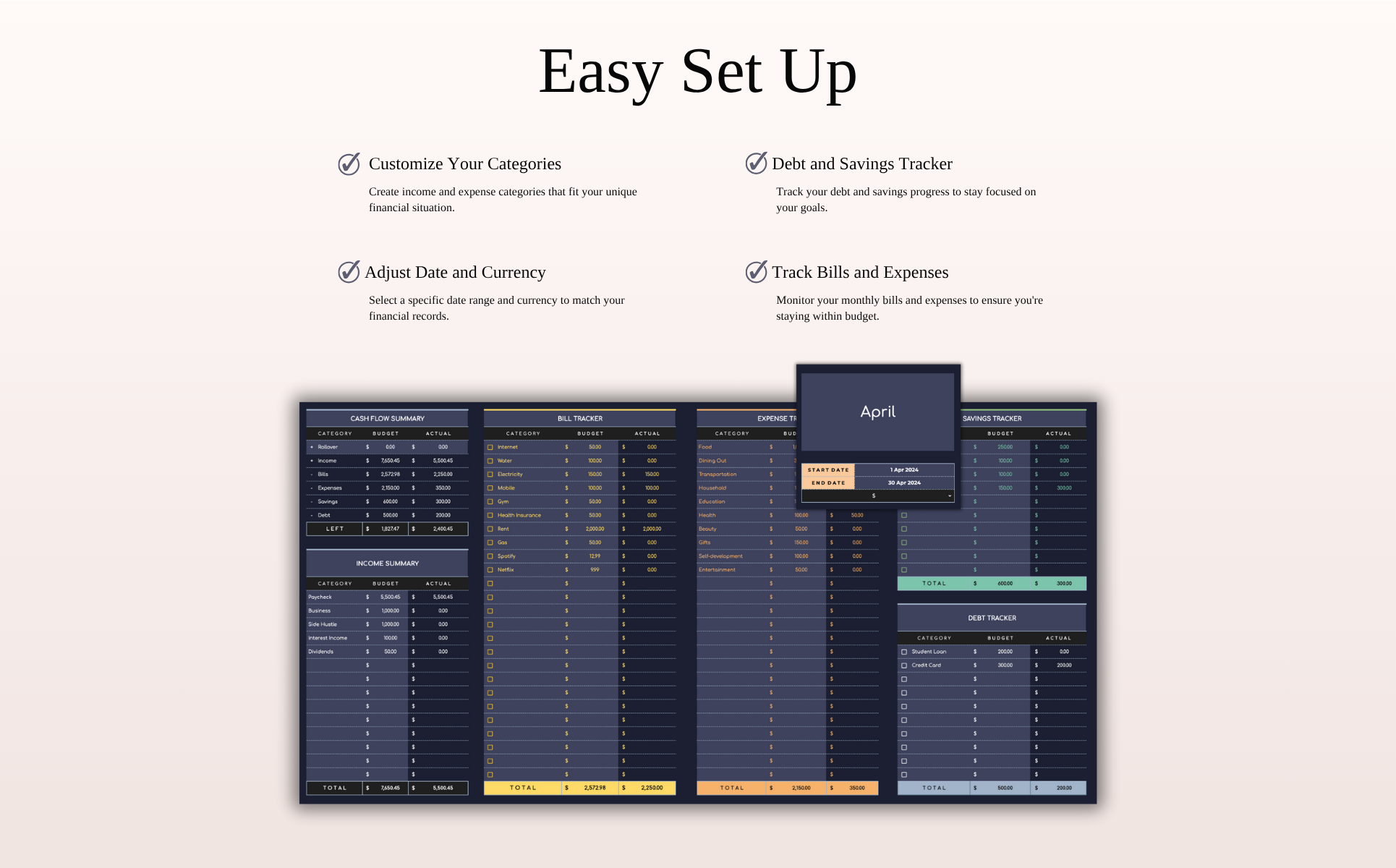 - Checkboxes for bills, debts & savings