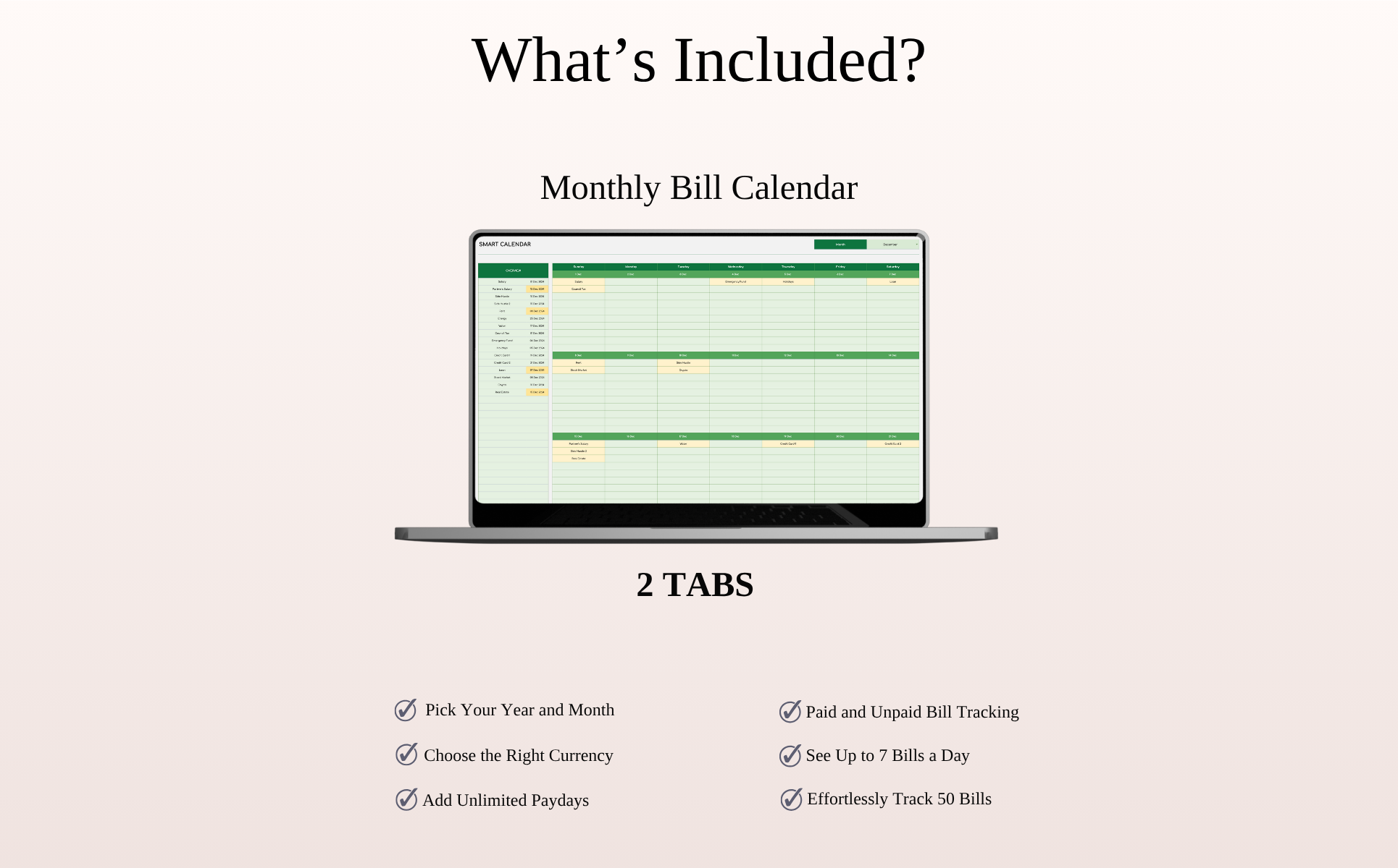 Never miss a due date again with a calendar-style bill tracker that keeps your payments, amounts, and dates clearly visible.