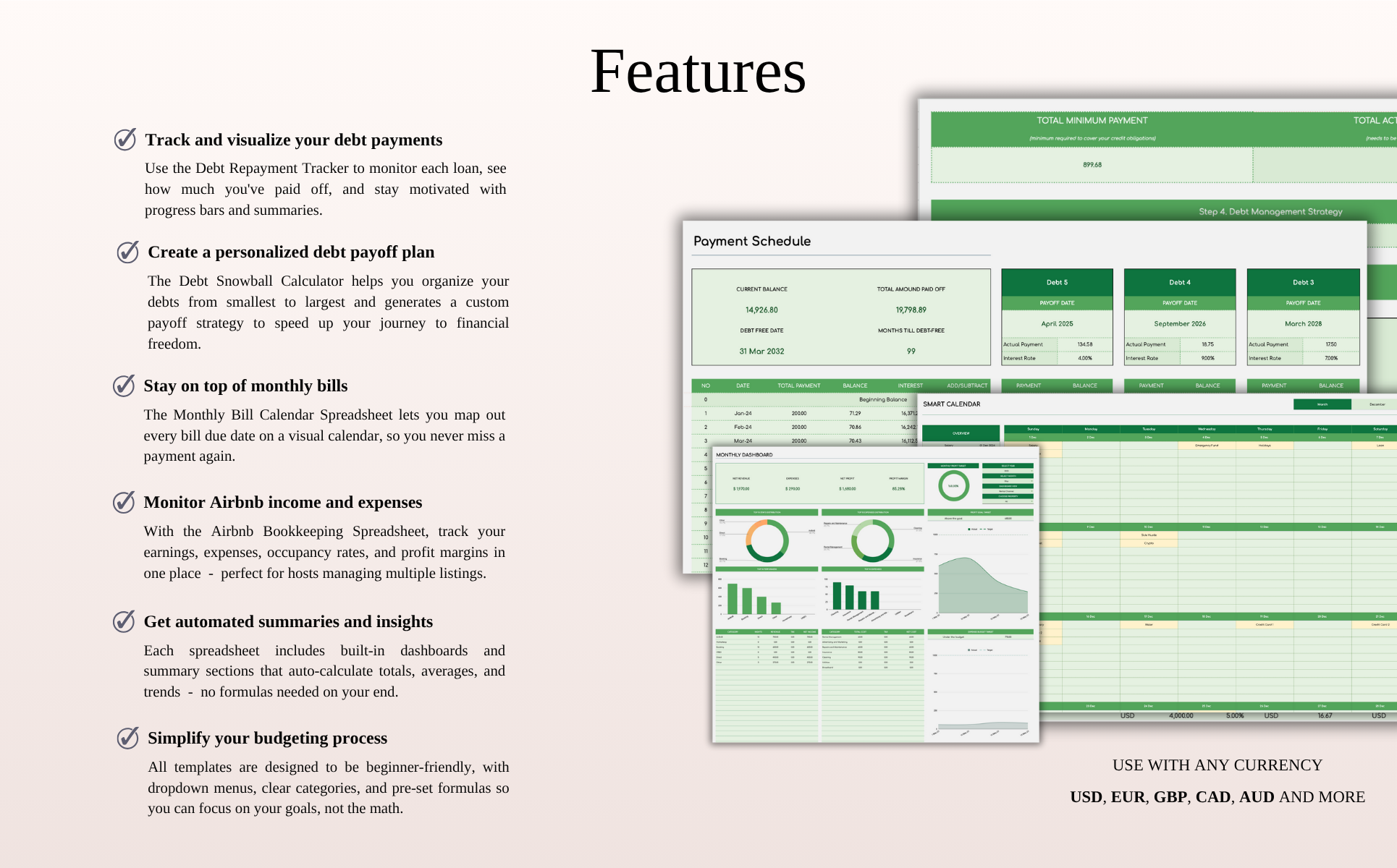 Take charge of your finances with this complete Budgeting & Debt Management toolkit. Whether you're aiming for financial independence, tracking rental income, or just trying to stay ahead of monthly bills, this collection of intuitive spreadsheets will help you simplify money management — no advanced skills required.