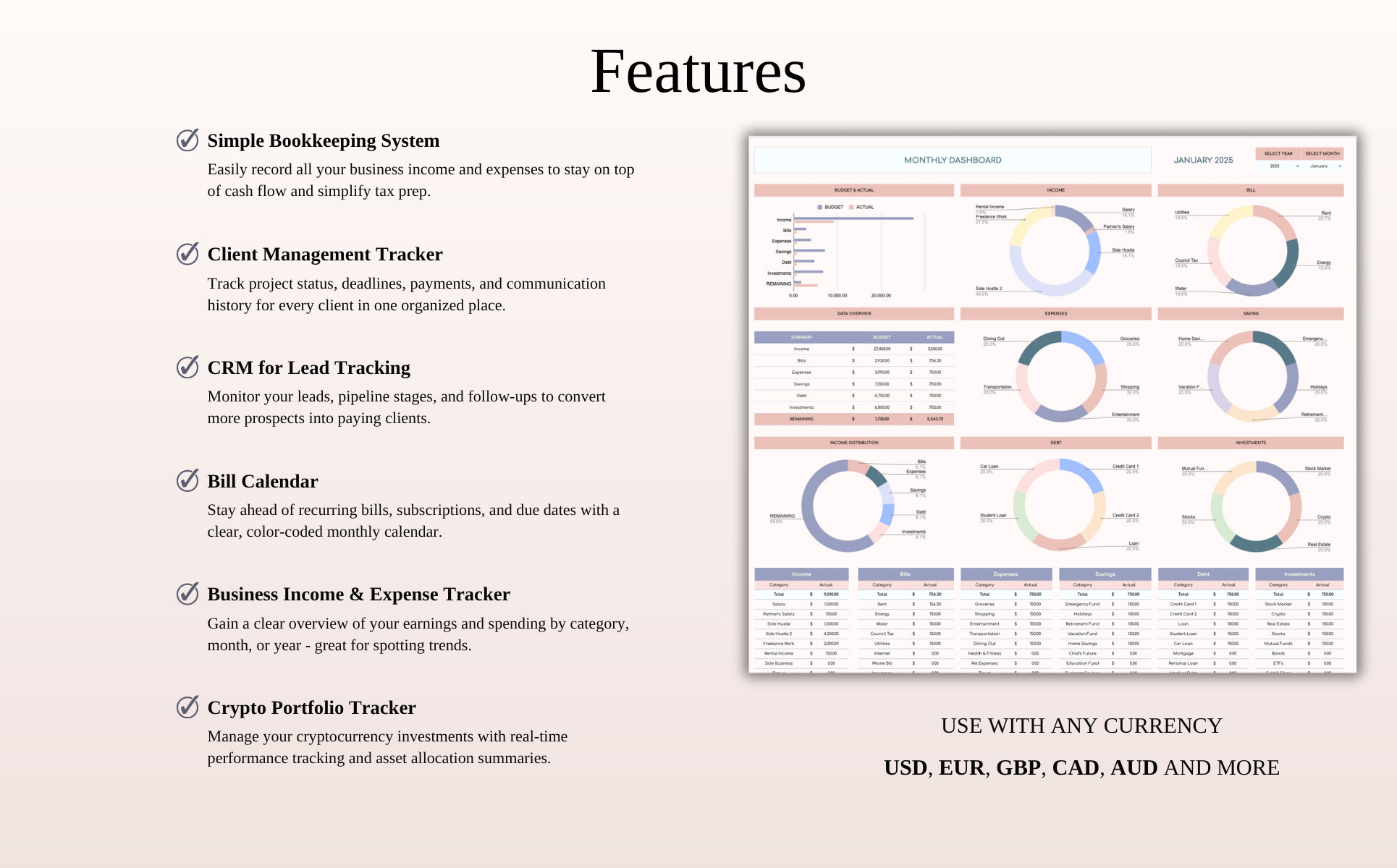 Each spreadsheet is built to simplify a specific part of your business — from budgeting and tracking clients to managing crypto assets — so you can spend less time organizing and more time growing.