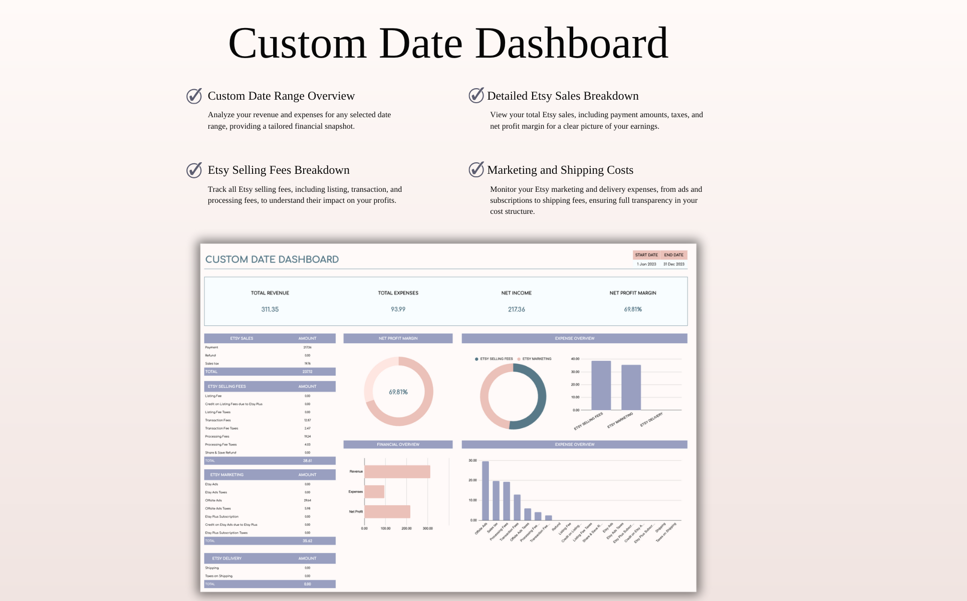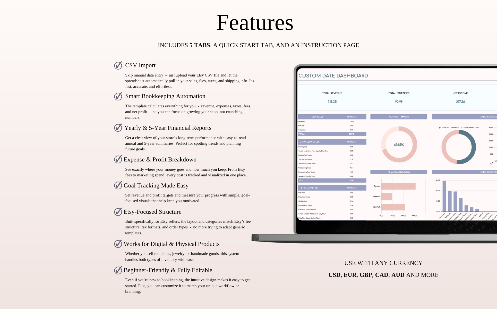 This tool is ideal for Etsy shop owners looking for an easy way to manage their store finances and make data-driven decisions. Whether you're new or growing, this template helps you stay organized and focused on scaling your business.