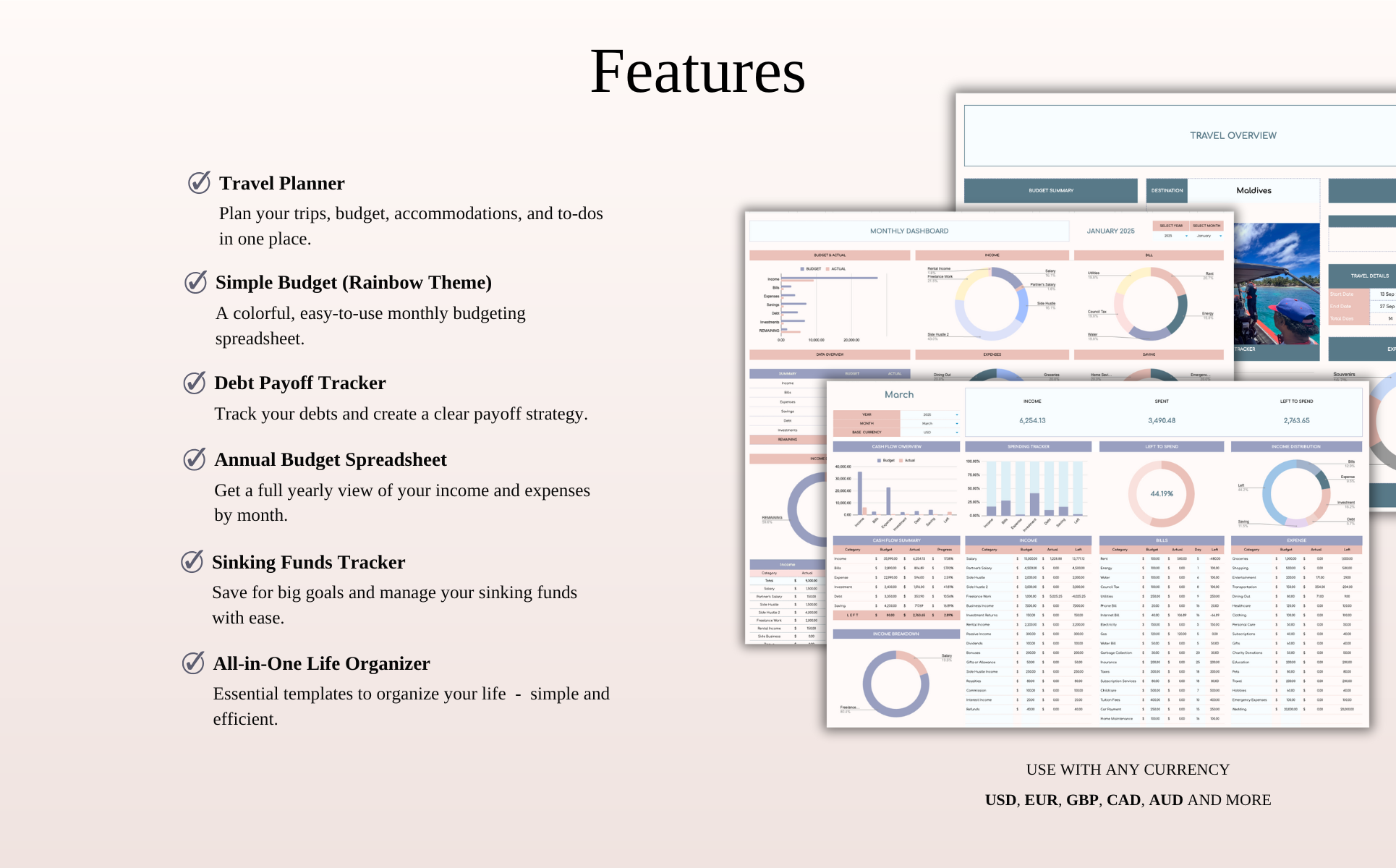 Bring order to your finances, travel plans, and personal goals with the Life Organizer Bundle — a thoughtfully designed set of 5 smart spreadsheets to help you stay on top of everything that matters. From budgeting and saving to planning your next big trip, this bundle helps you live with more clarity and confidence.