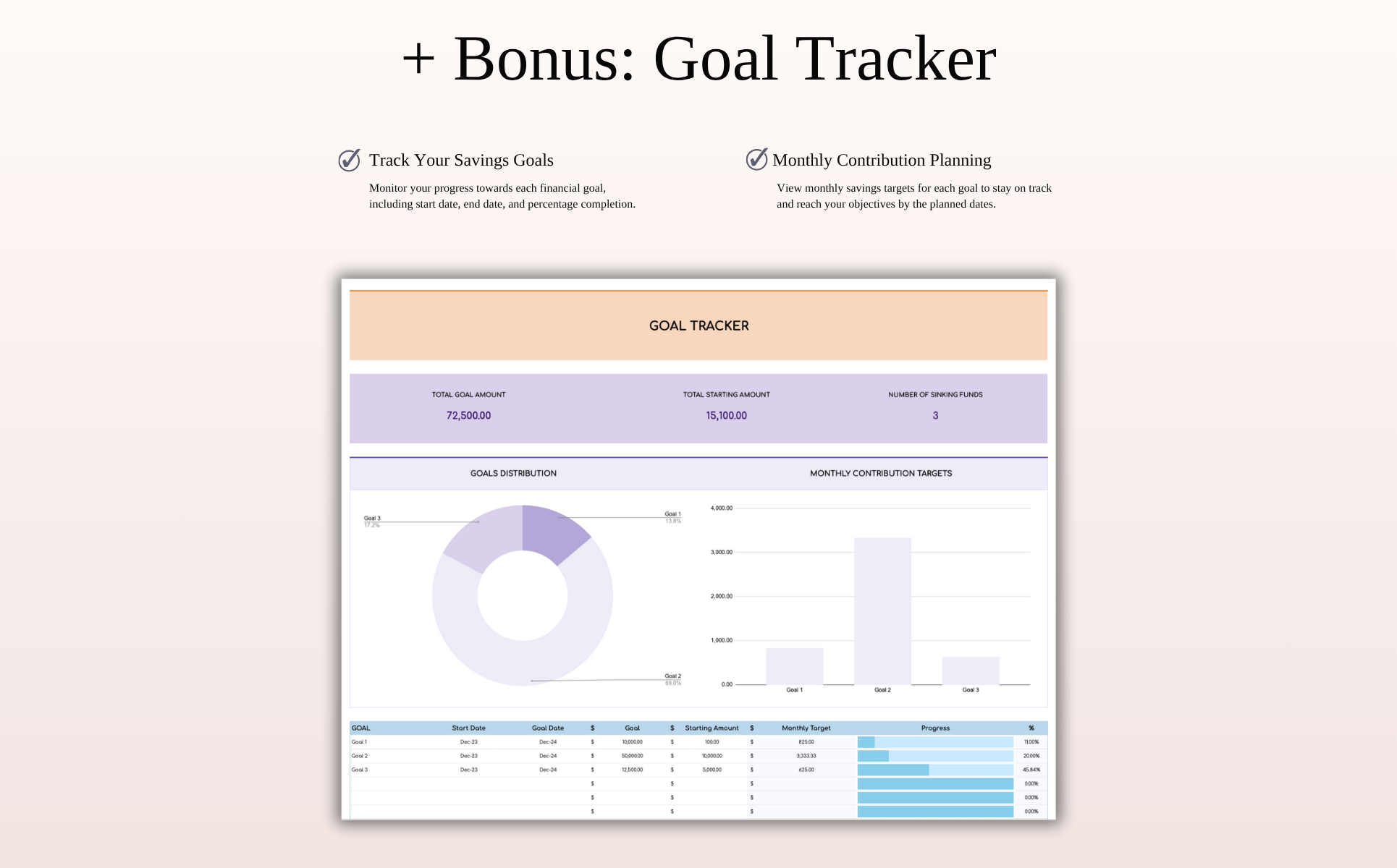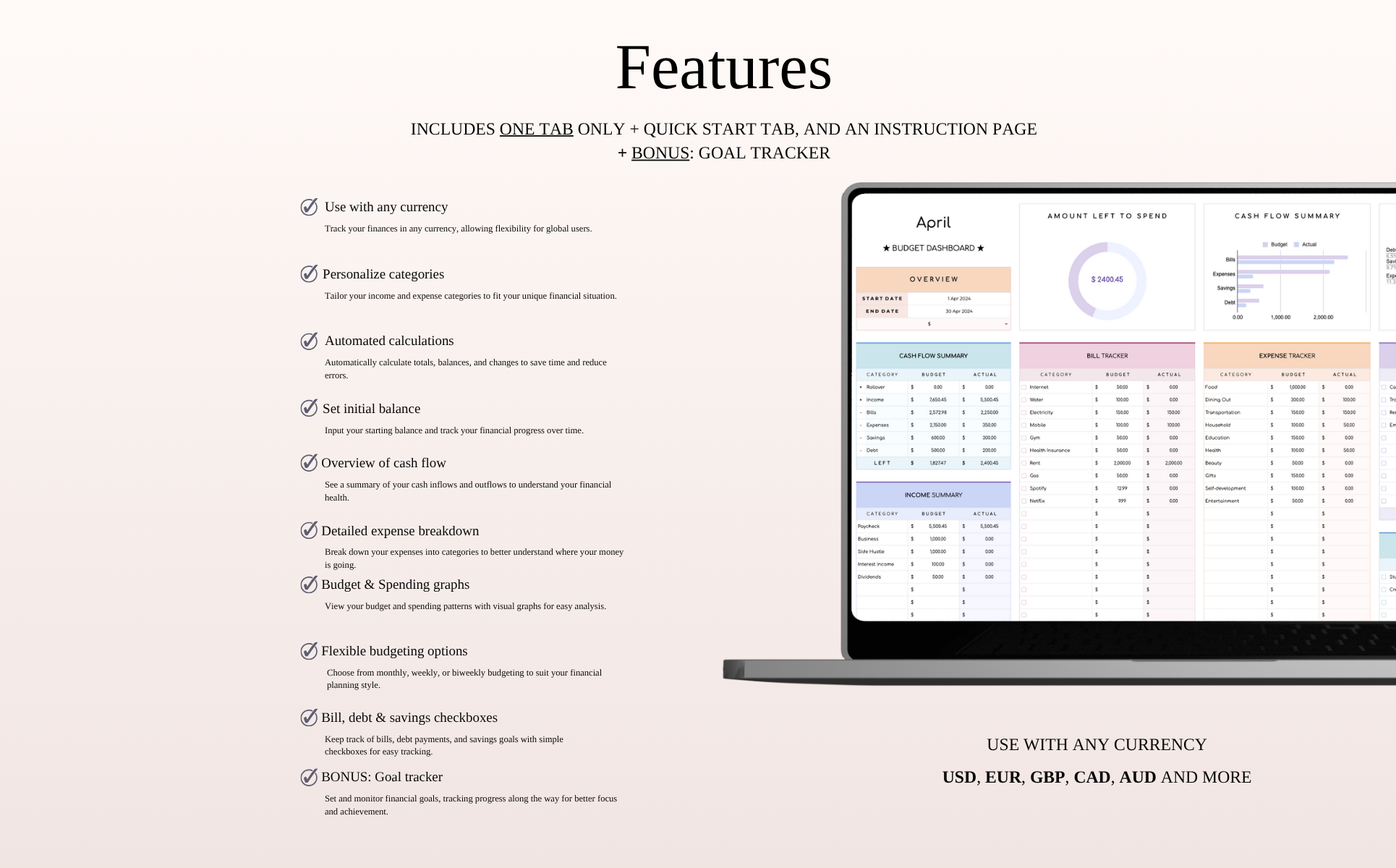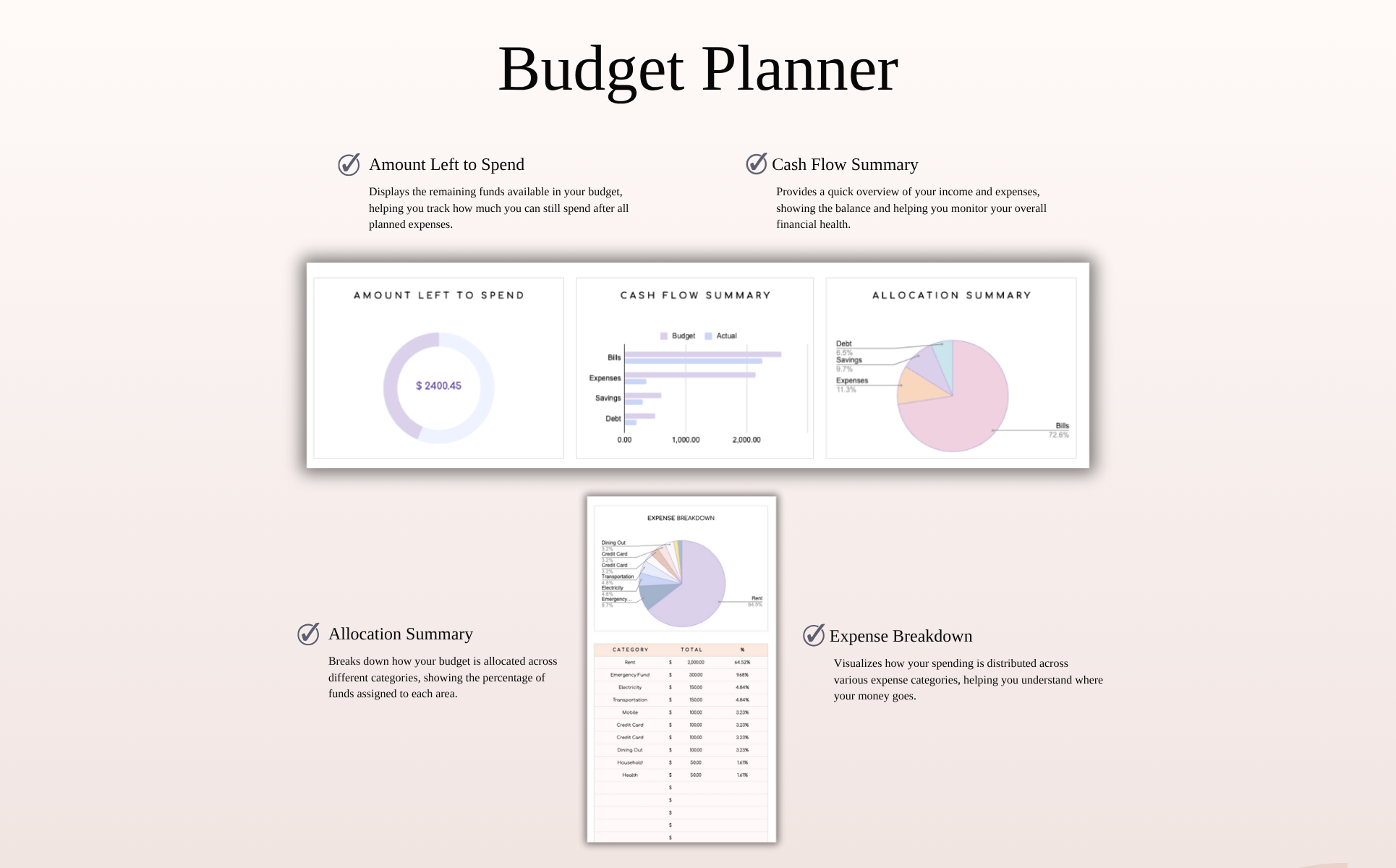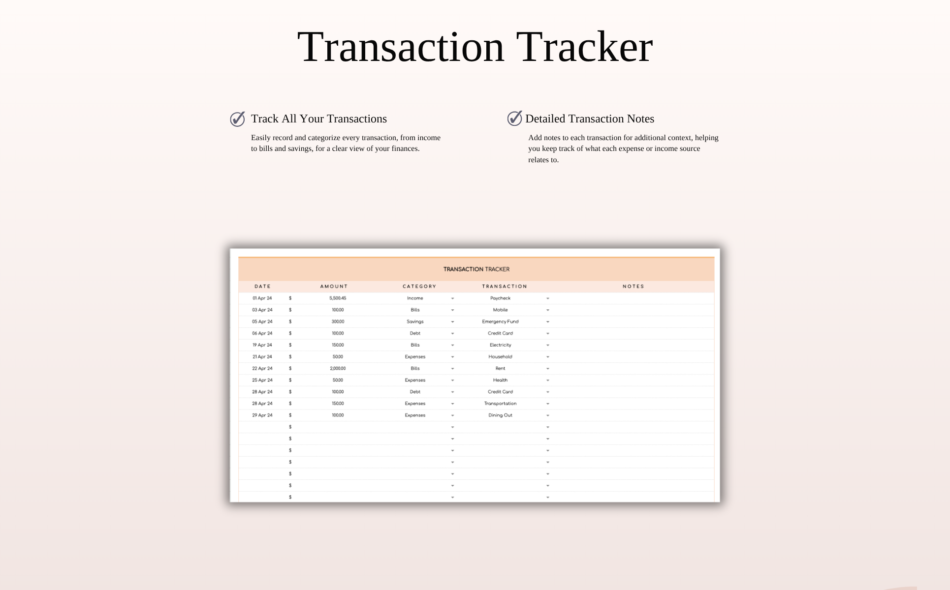 With these features, you’ll be able to configure your budget, track transactions, monitor monthly progress, and stay on top of your financial goals in one comprehensive tool.