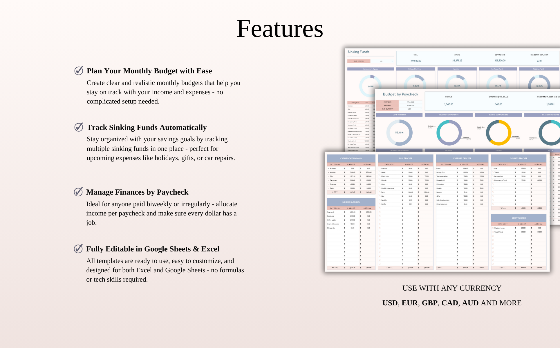Whether you're organizing your monthly spending, budgeting around each paycheck, or preparing for future expenses, this bundle offers a clear, beginner-friendly way to manage your personal finances. Compatible with both Google Sheets and Excel, all templates are easy to customize and ready to use from day one — no technical skills needed.