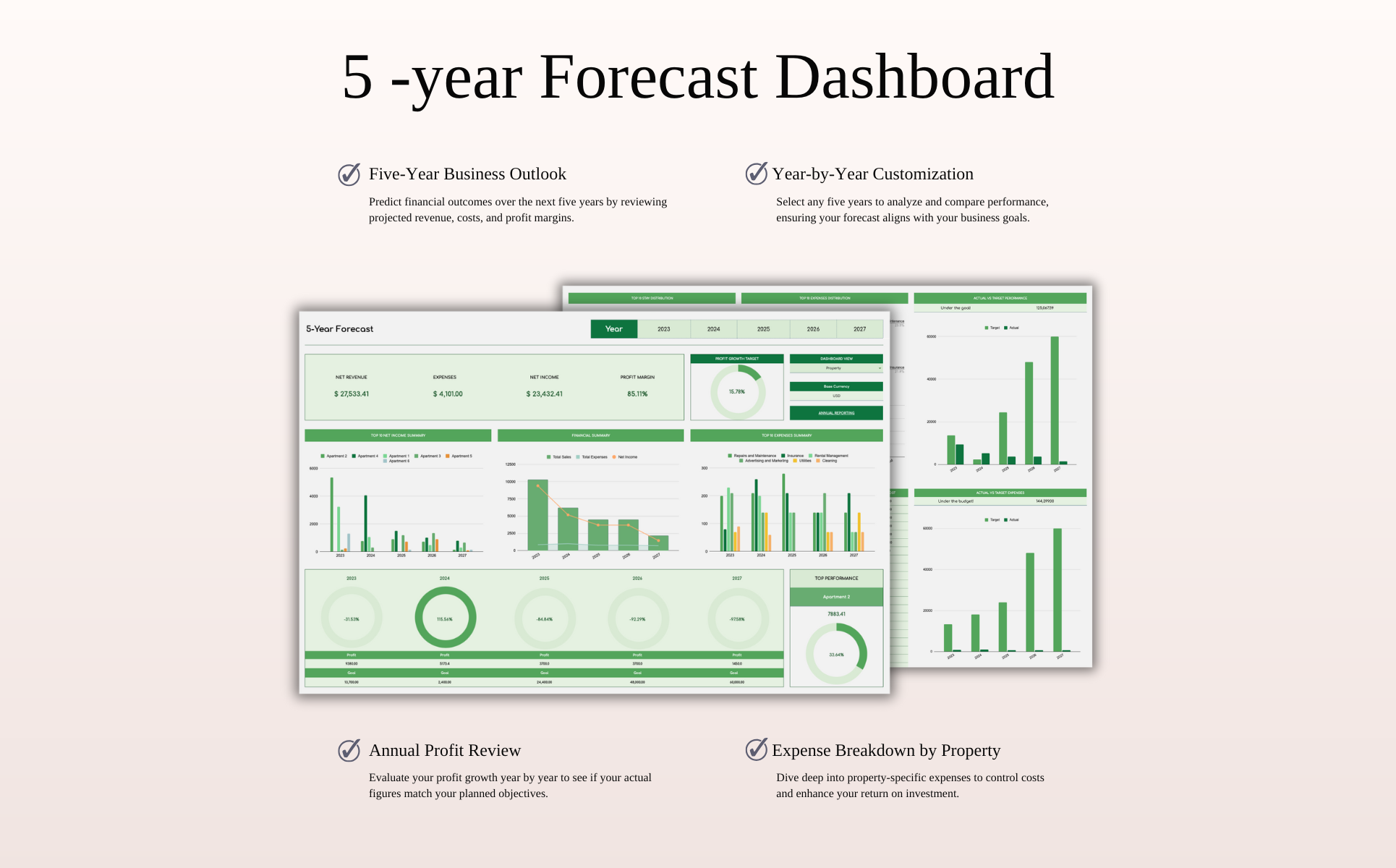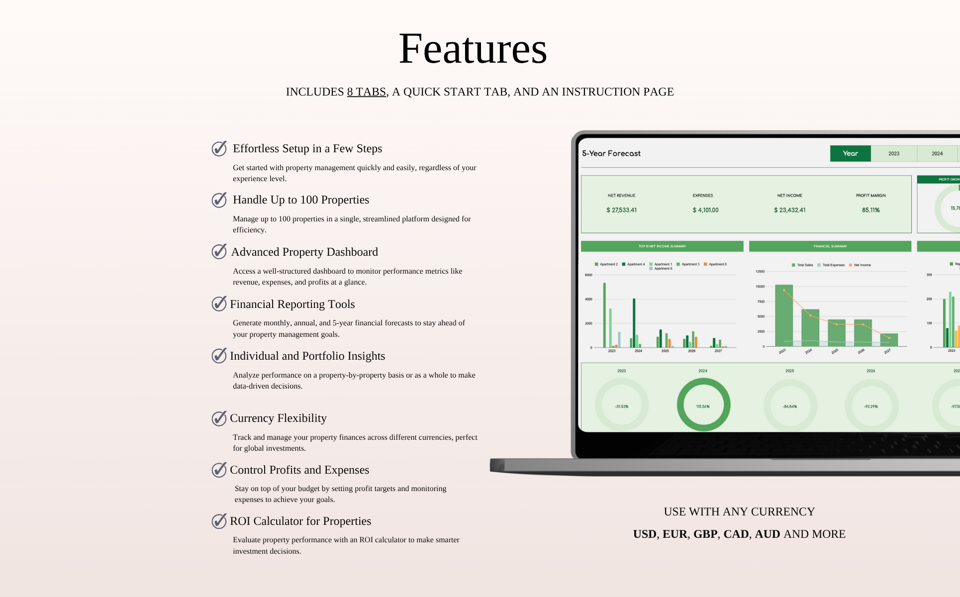 Whether you're handling one unit or dozens, this tool helps you centralize all your financial data in one place. Input transactions with ease and watch as the spreadsheet automatically generates detailed overviews—monthly trends, annual summaries, and 5-year forecasts.
