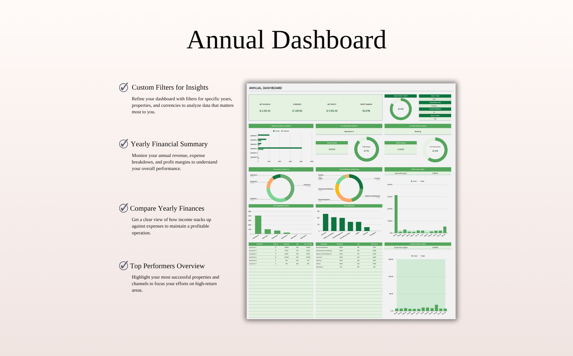 Its clean Green Theme layout and intuitive dashboards let you instantly see how each property performs, spot top channels, compare expenses, and track profit goals. With smart features like a built-in ROI calculator and multi-currency support, you’ll spend less time on spreadsheets and more time growing your business.