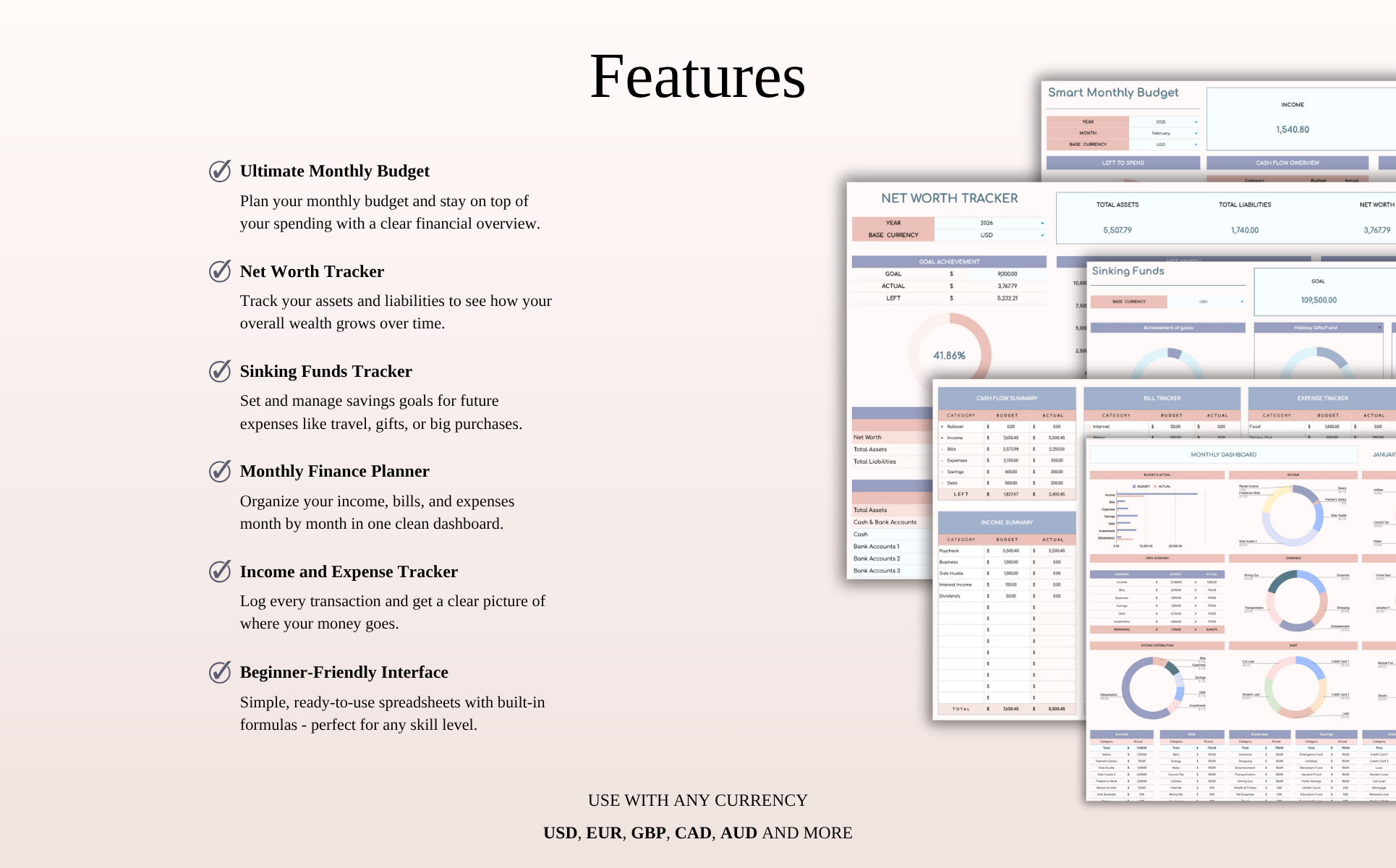 Manage your finances confidently with this all-in-one toolkit of 5 simple spreadsheets. Whether you're planning your monthly budget, tracking everyday expenses, building savings, or evaluating your financial growth, this toolkit helps bring clarity and structure to your money management.