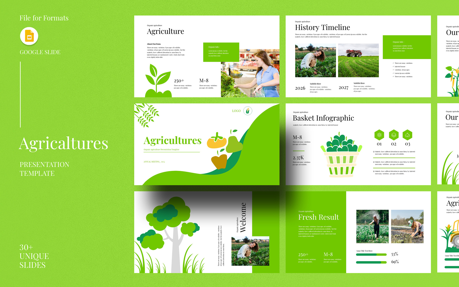 This Agriculture Google Slide Template contains 30 useful slides for business plans and processes such as company introduction, market analysis, products and services, competitive strategy, marketing plan, sales method, investing, organization and management team, social media marketing, and many more