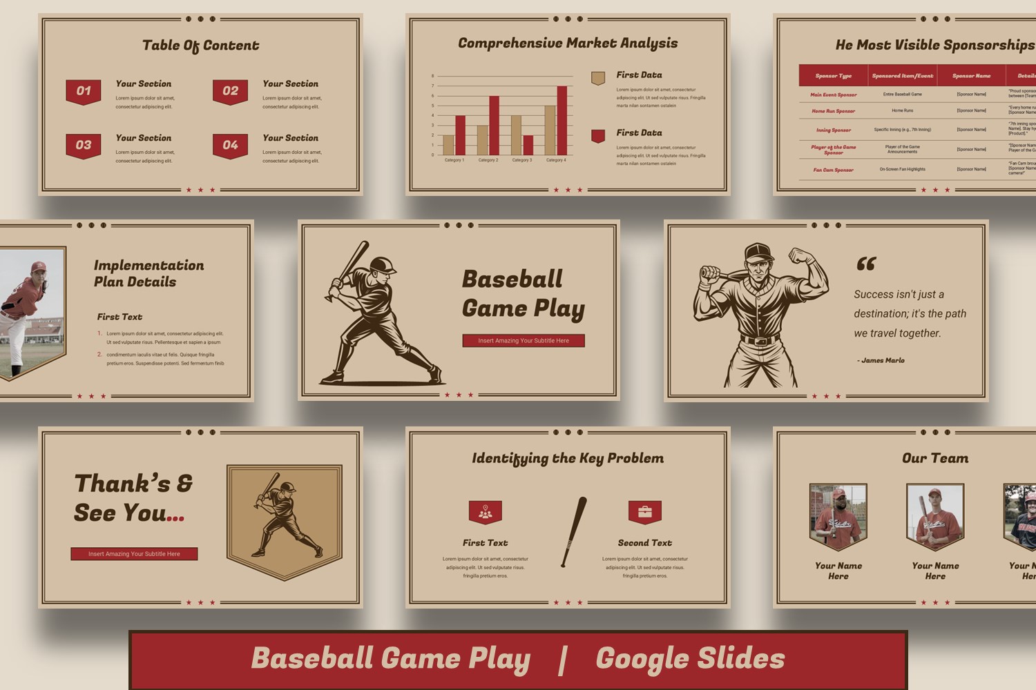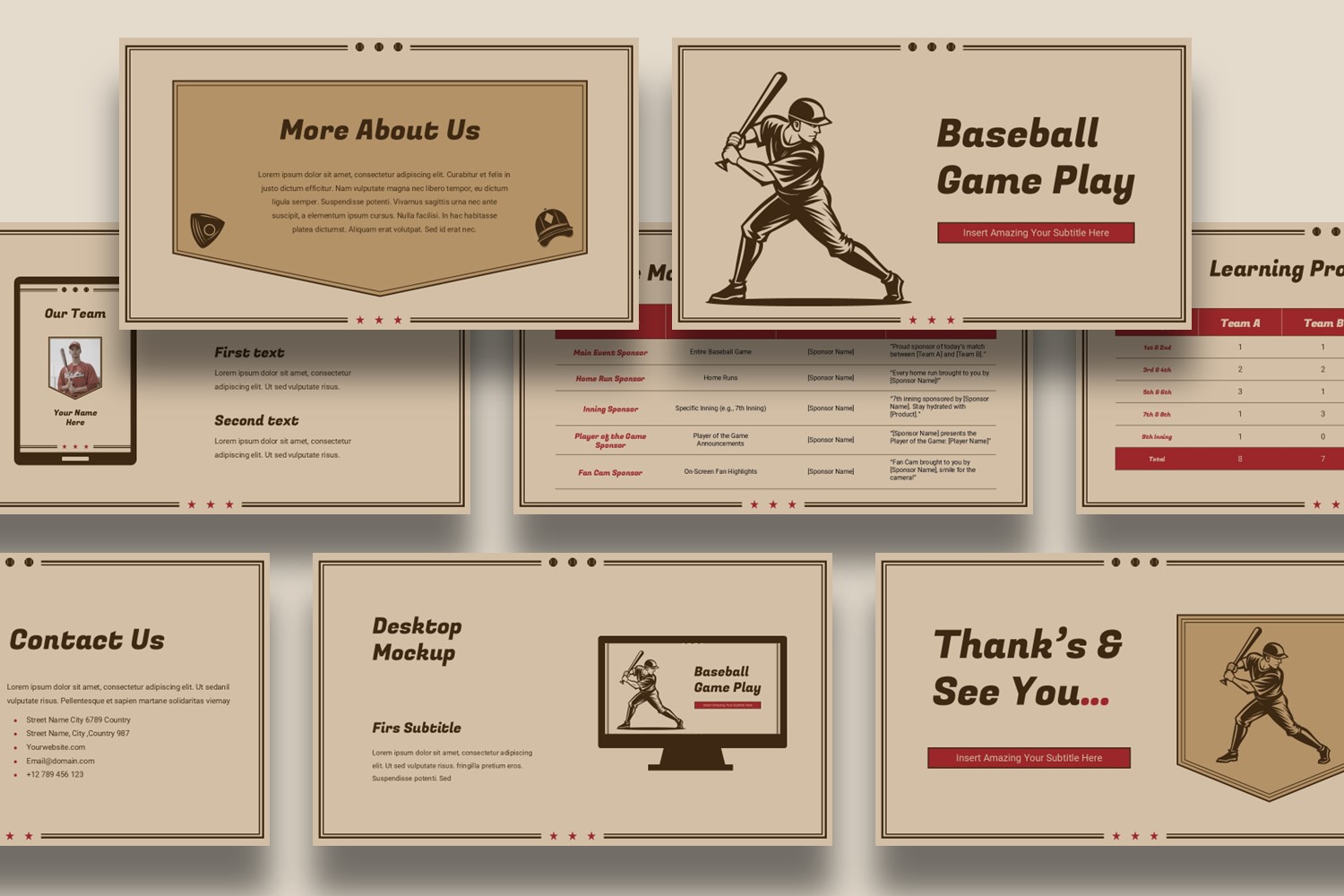Hit a home run with your presentations using our Baseball Sport template for Google Slides. This deck features an inviting warm beige background accented with rich deep red and dark brown tones, bringing an authentic baseball feel to every slide. Designed with engaging illustrations throughout, this template is perfect for showcasing game strategies, team stats, player profiles, and training tips. Ideal for coaches, sports analysts, and baseball enthusiasts, this template adds a professional yet spirited touch to any baseball-themed presentation.
