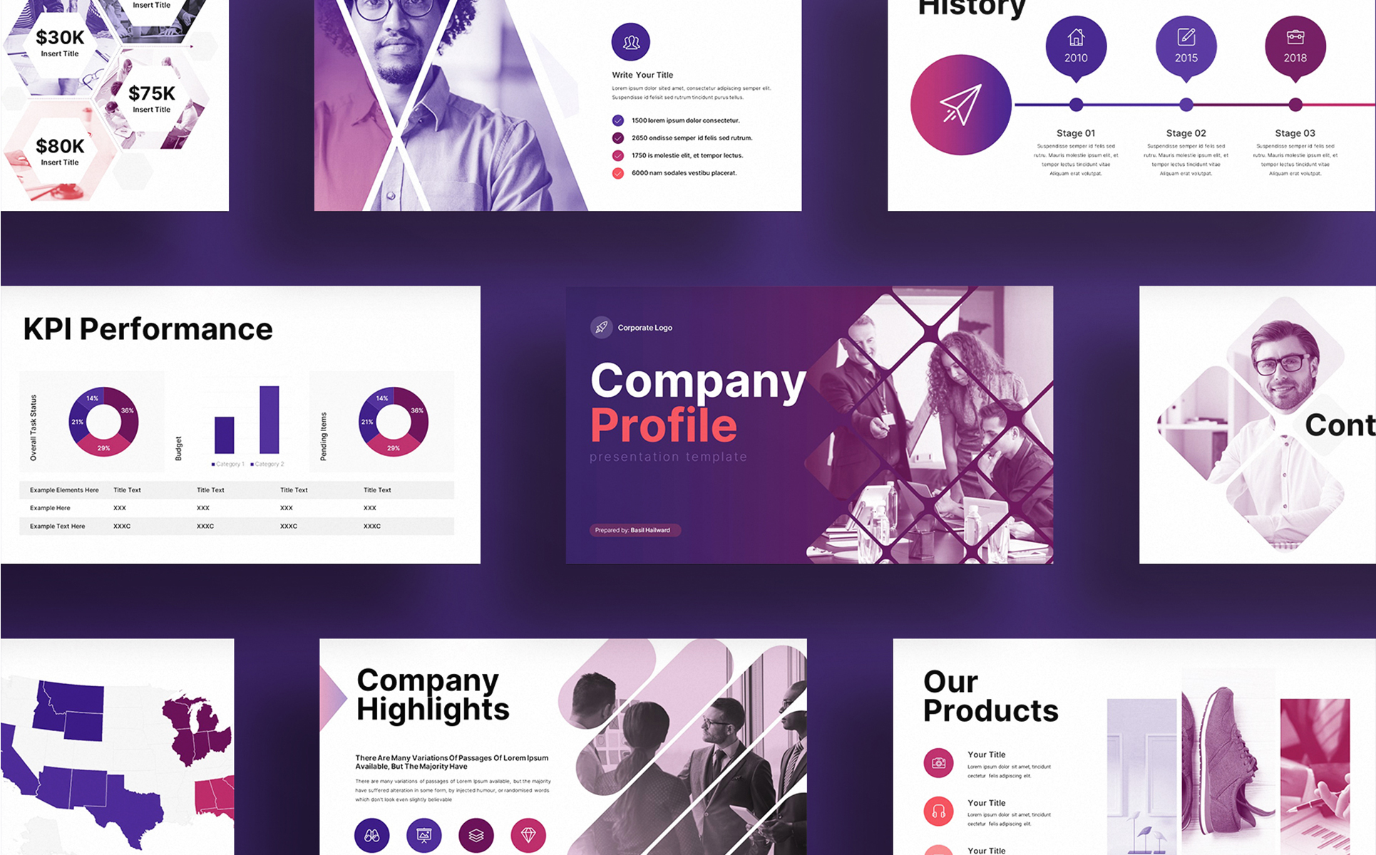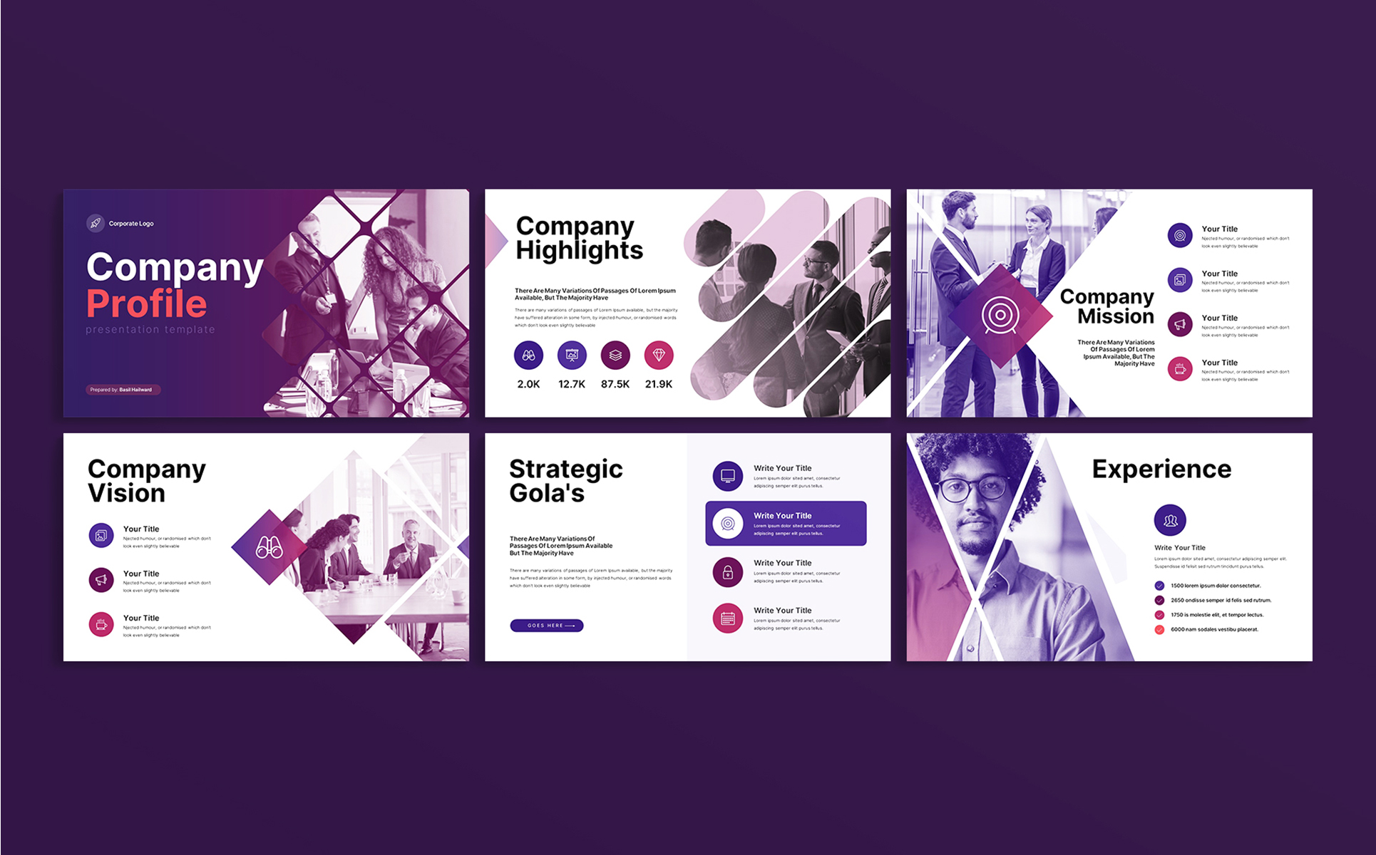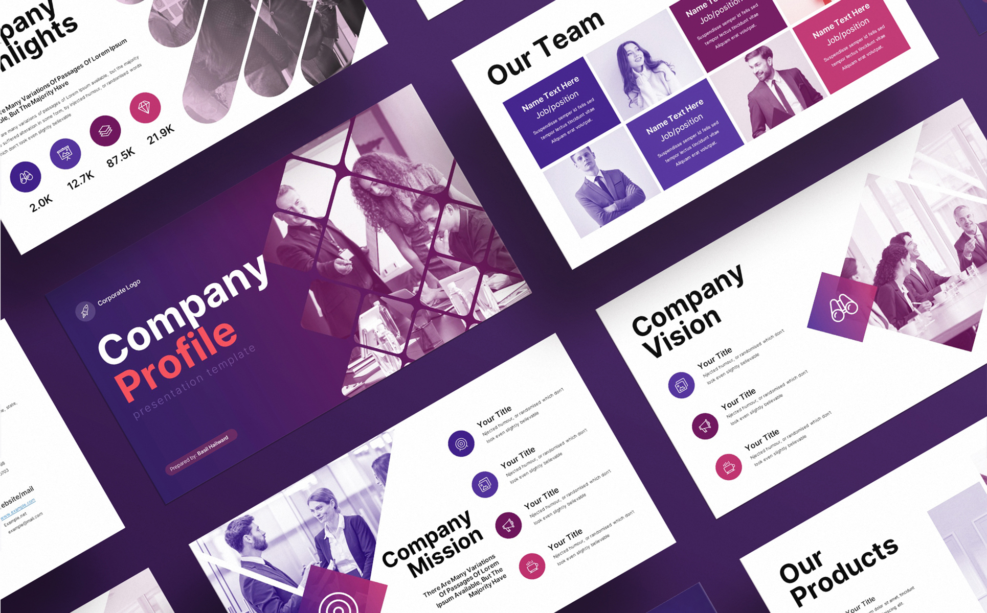 A Company Profile is a written introduction to a company that highlights its mission, goals, strengths, and products or services. This essential document can be used for various purposes, such as attracting funding from potential investors, building a brand image, and recruiting talent. This presentation template has all the most needed ready-to-use topics.