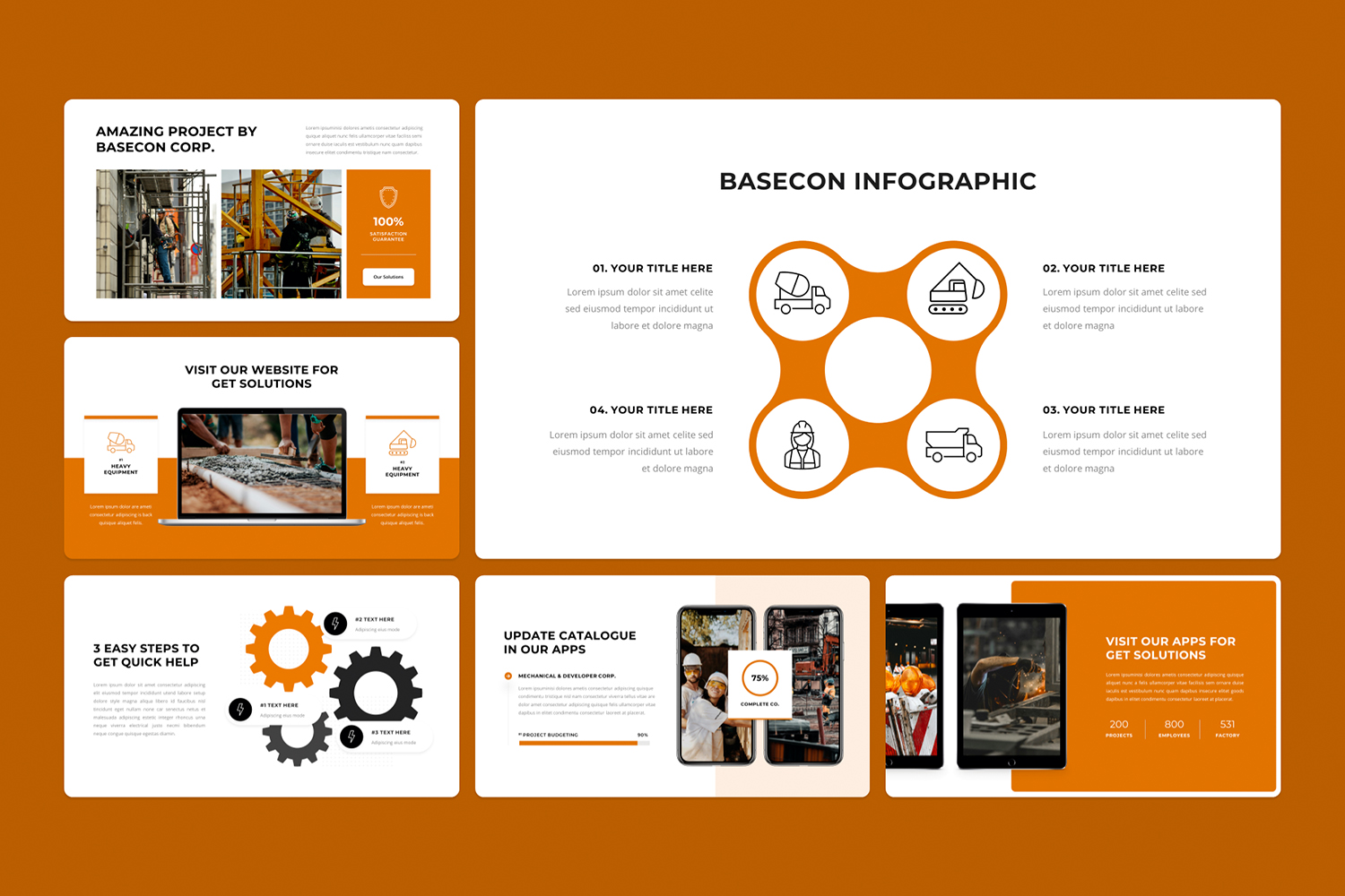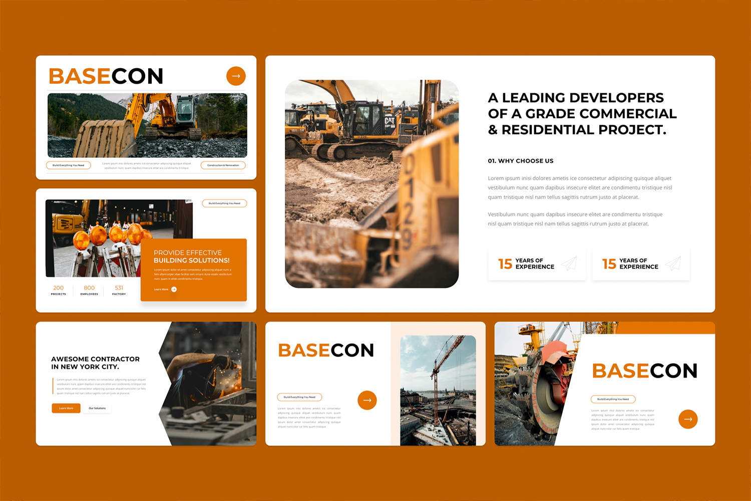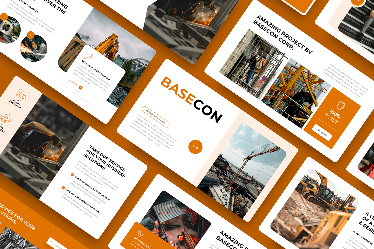 Basecon is a clean, industrial-style deck built for contractors, builders, and engineering firms. Using bold orange highlights, strong grids, and clear iconography, it helps you present services, heavy-equipment capability, safety guarantees, and track record with confidence.
