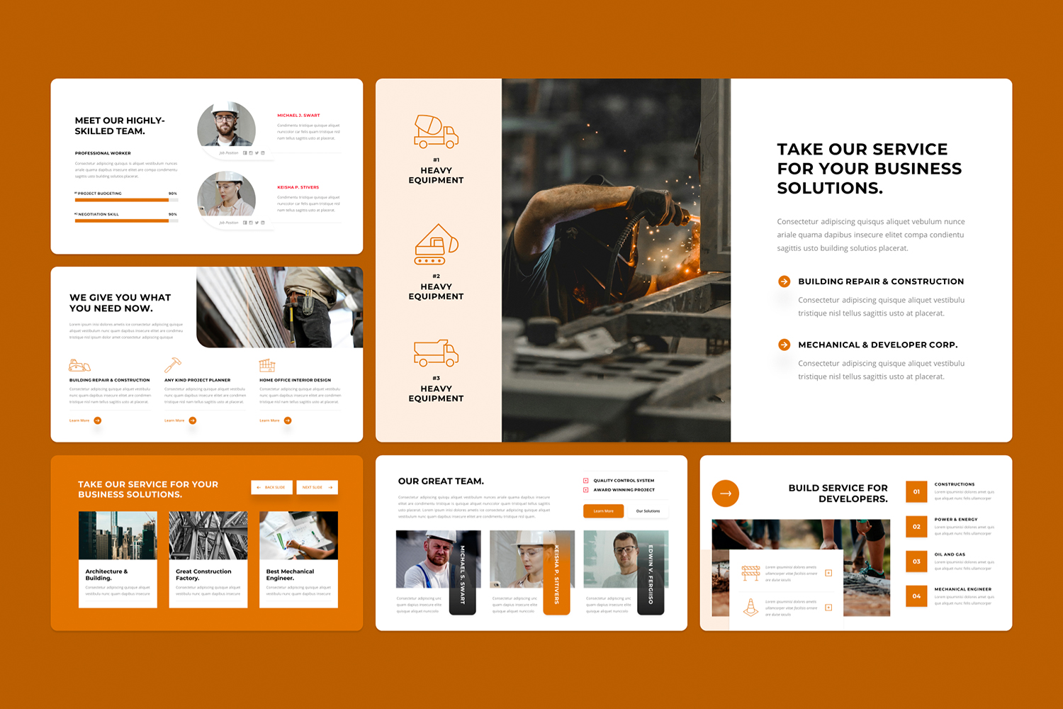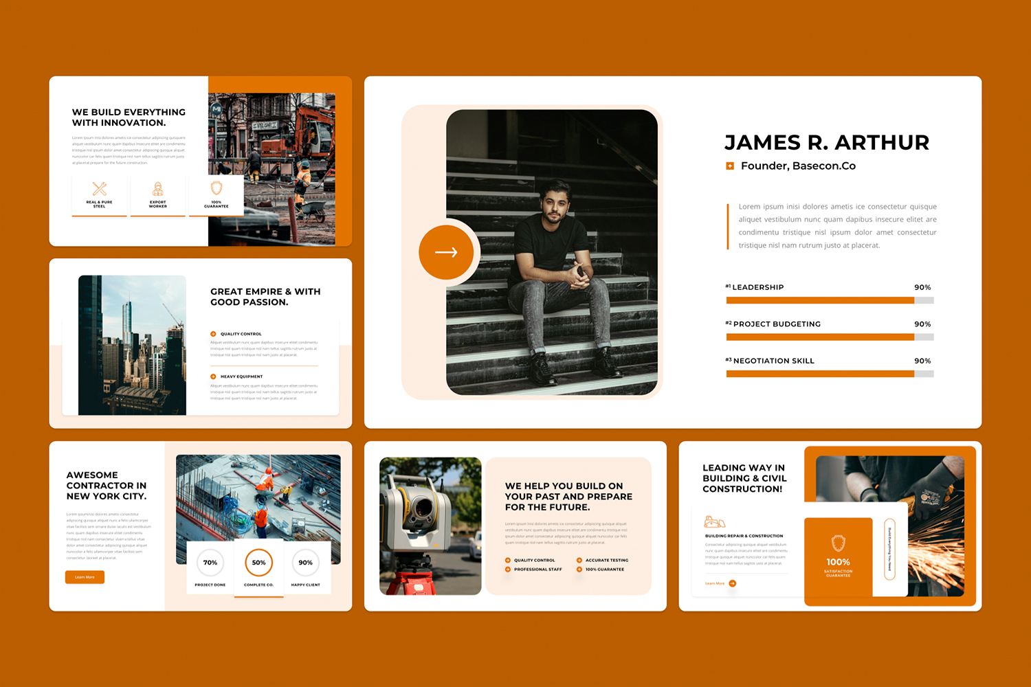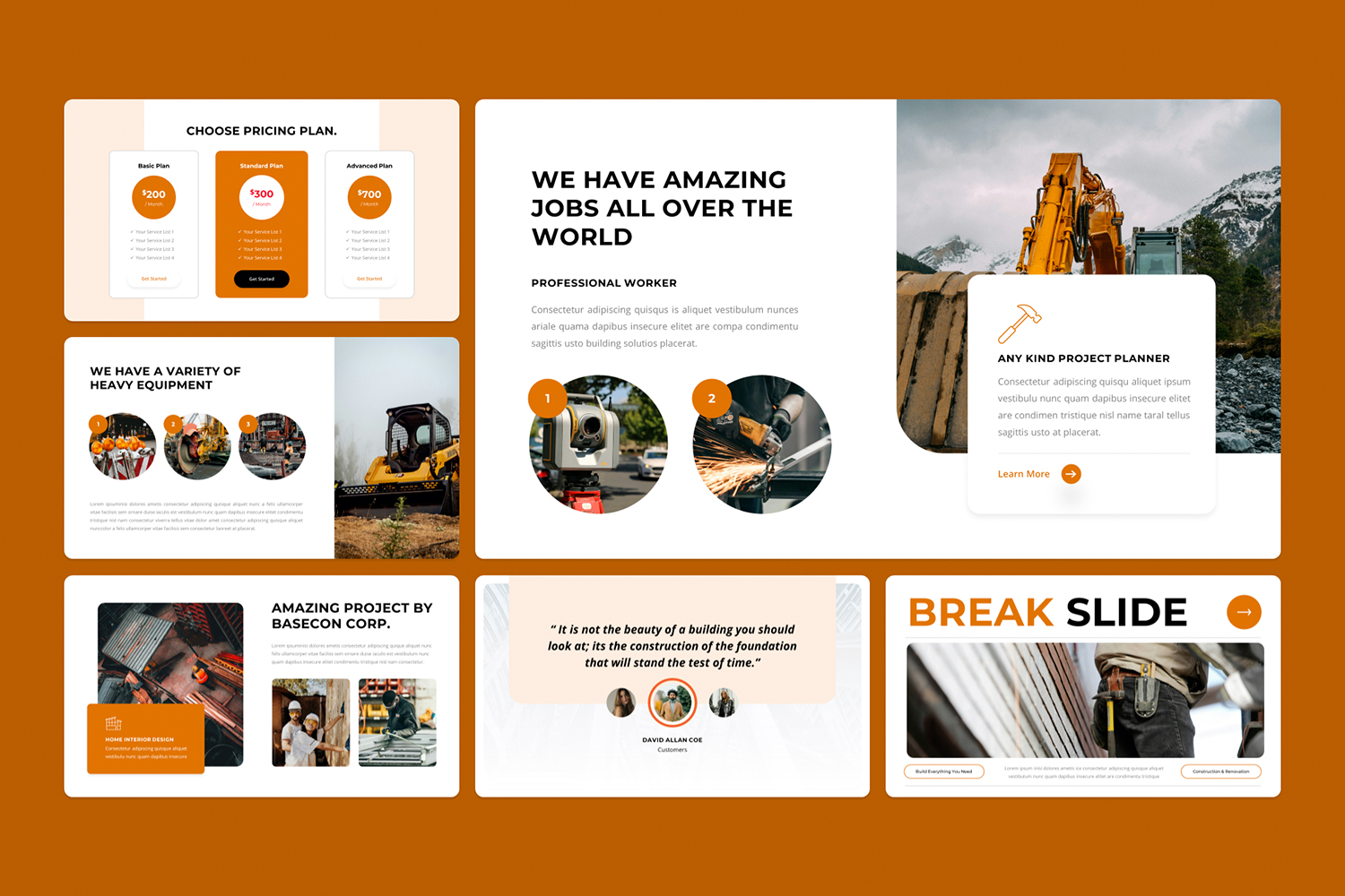 Basecon is a clean, industrial-style deck built for contractors, builders, and engineering firms. Using bold orange highlights, strong grids, and clear iconography, it helps you present services, heavy-equipment capability, safety guarantees, and track record with confidence.