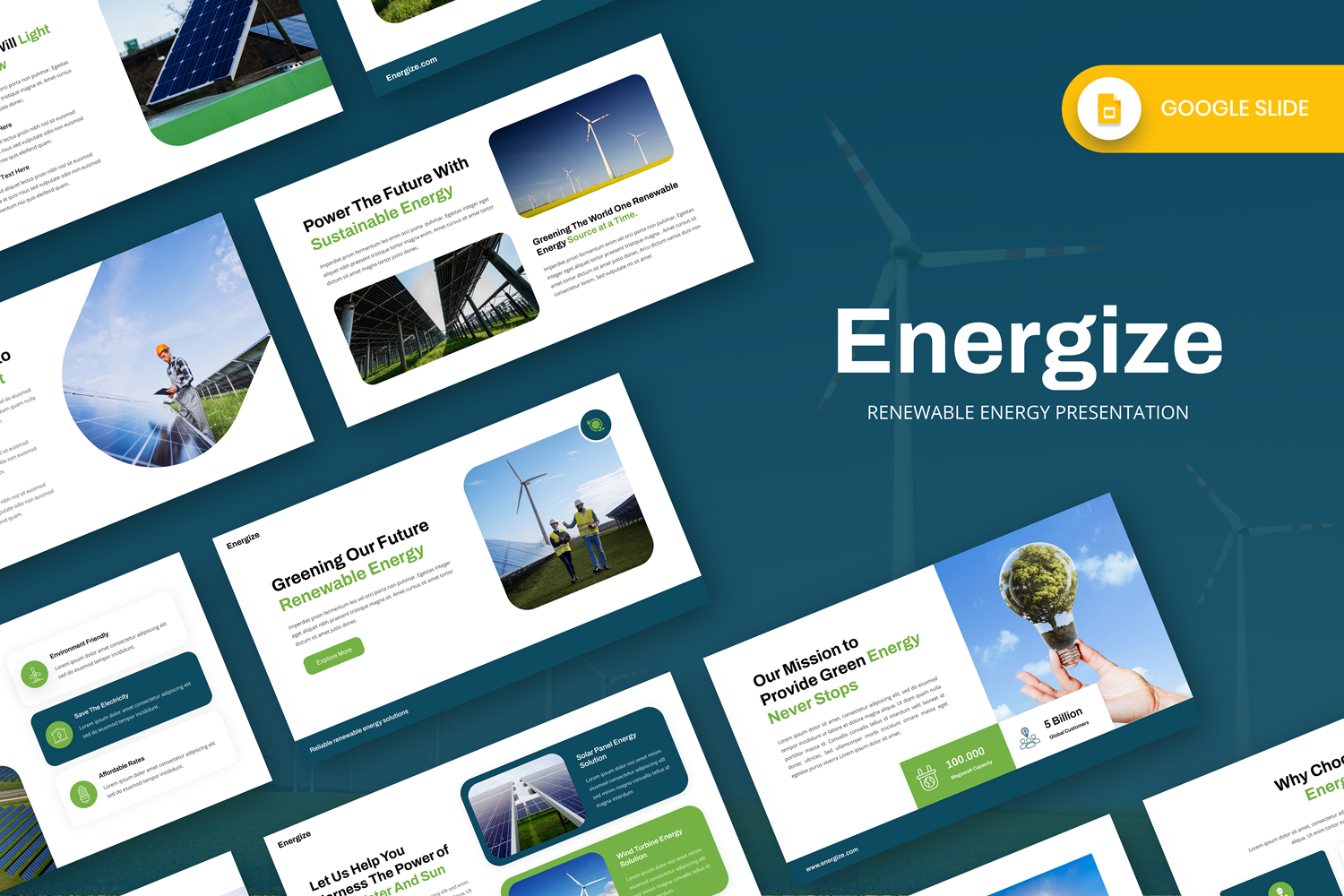 Introducing **Energize - Renewable Energy Google Slide Template**