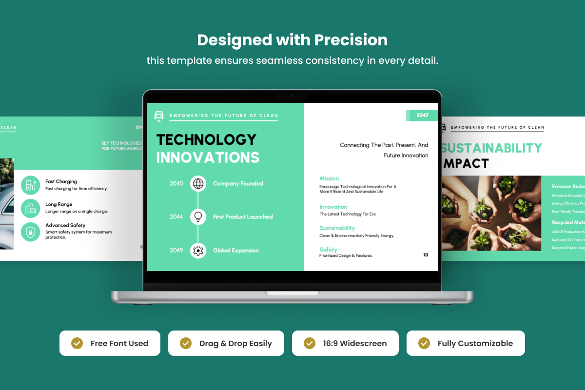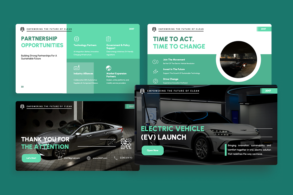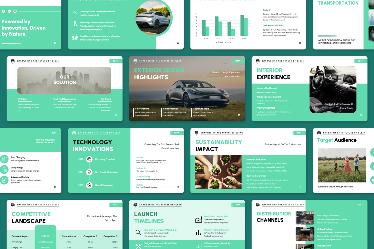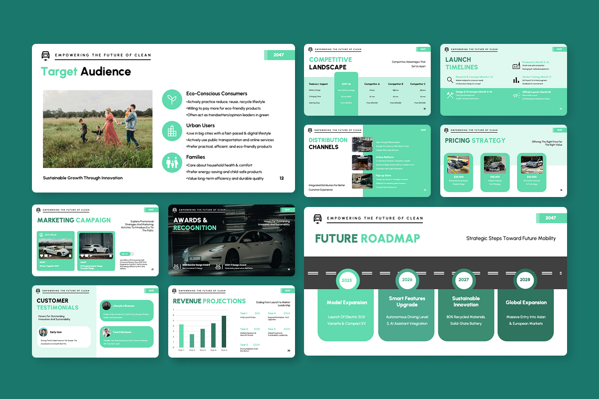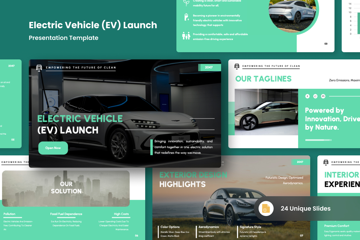 Professional Google Slides template for EV product launches. Combines futuristic clean layouts with storytelling design to highlight specs, innovation, and launch plans.