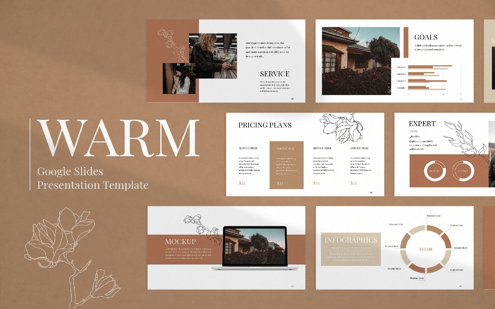 When creating the Warm Presentation Template, our primary focus was on universality so that companies from different areas can use this template. Whether you’re making a bid to an important new client or a business portfolio, this Google Slides template will allow you to turn your information and data into a presentation quickly and efficiently.