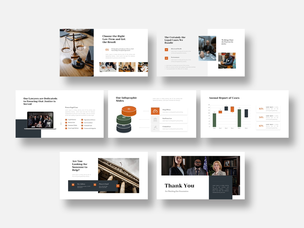 Featuring sections such as "Legal Advice," "Cases Handled," and "Our Team," this template allows you to showcase your firm's strengths comprehensively. You can detail your service offerings, introduce your legal team, and elucidate critical case information. The template's clean design ensures that the focus remains on essential content while maintaining an engaging appearance for your audience.