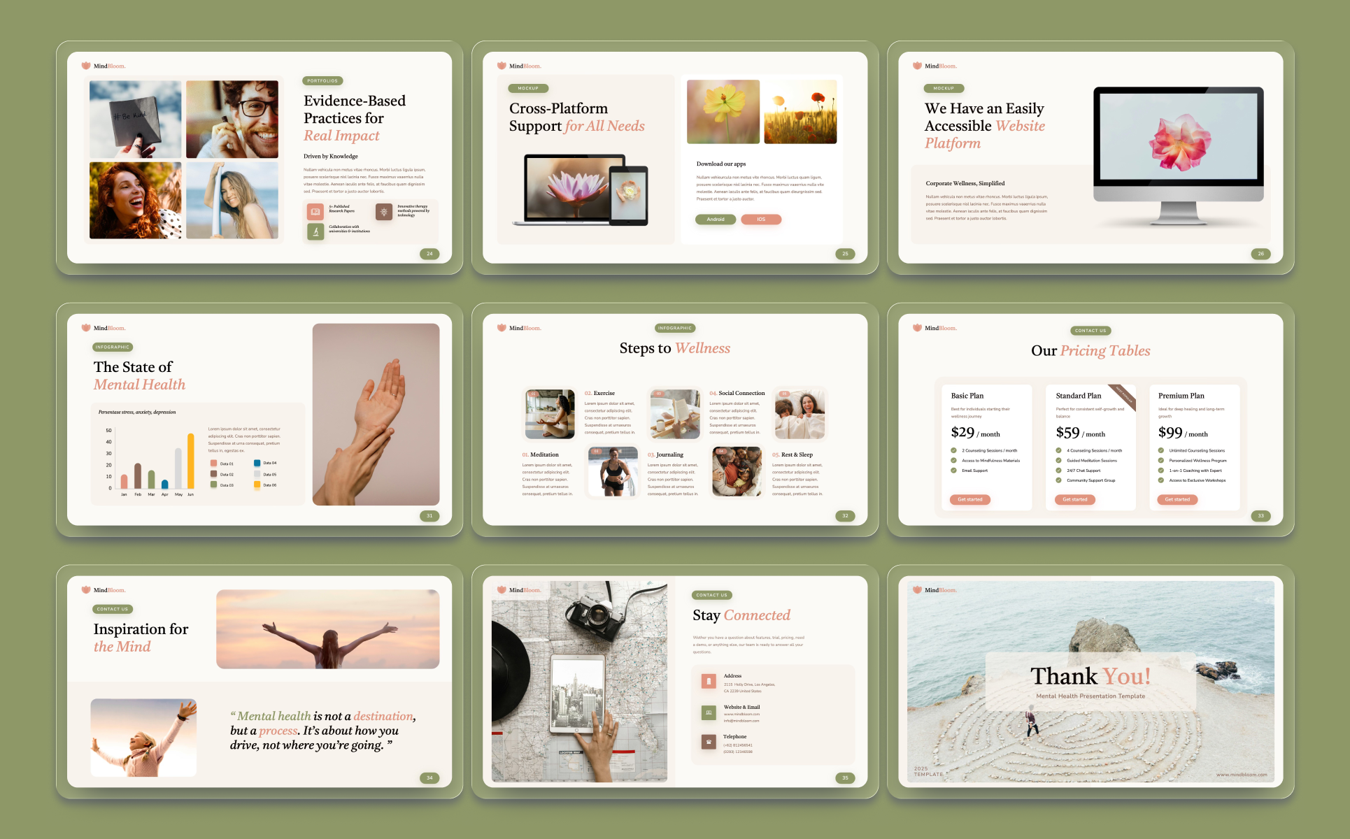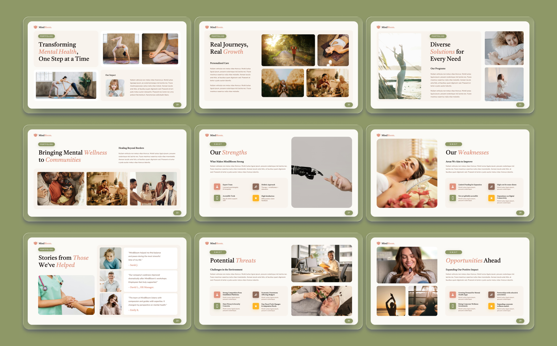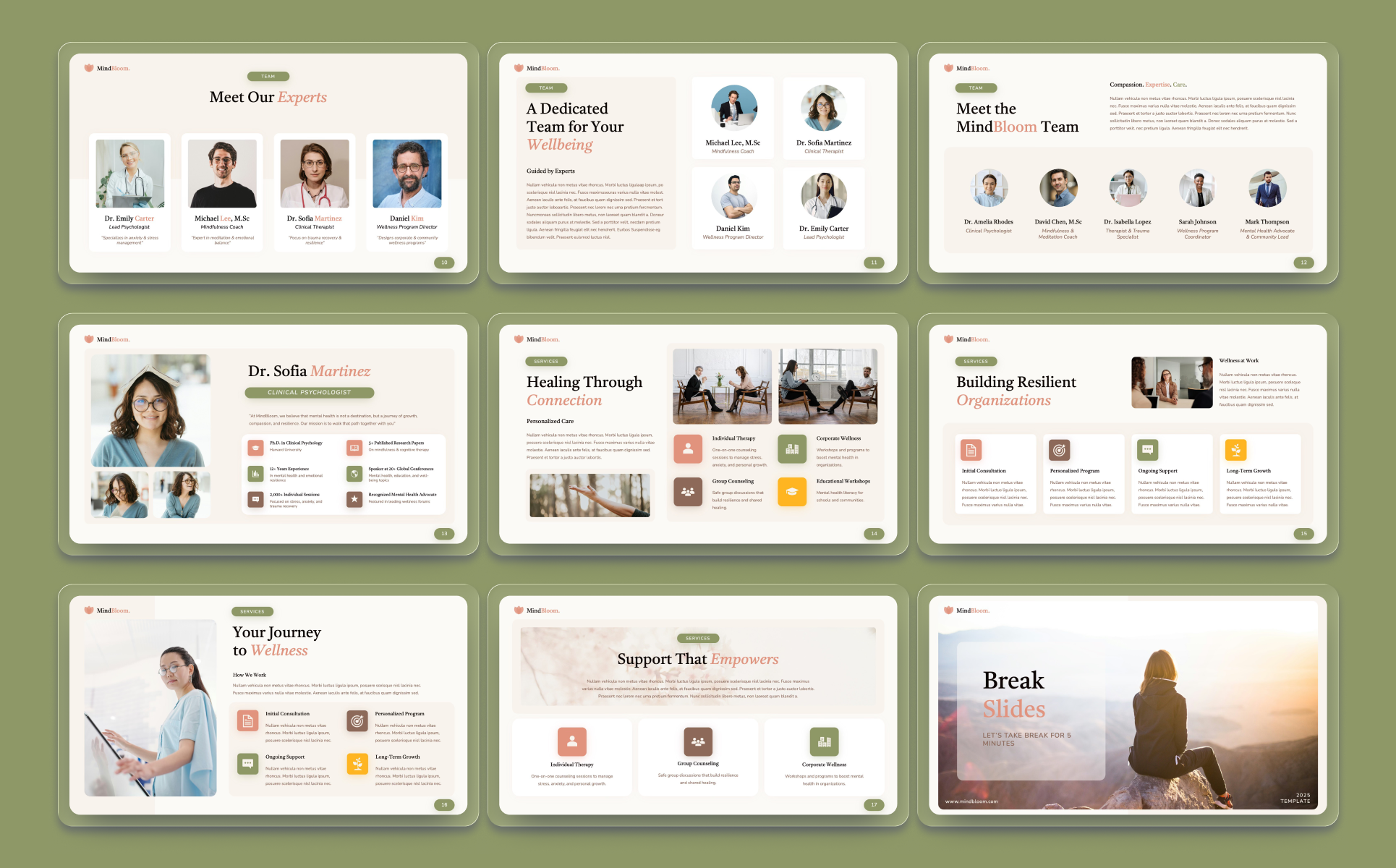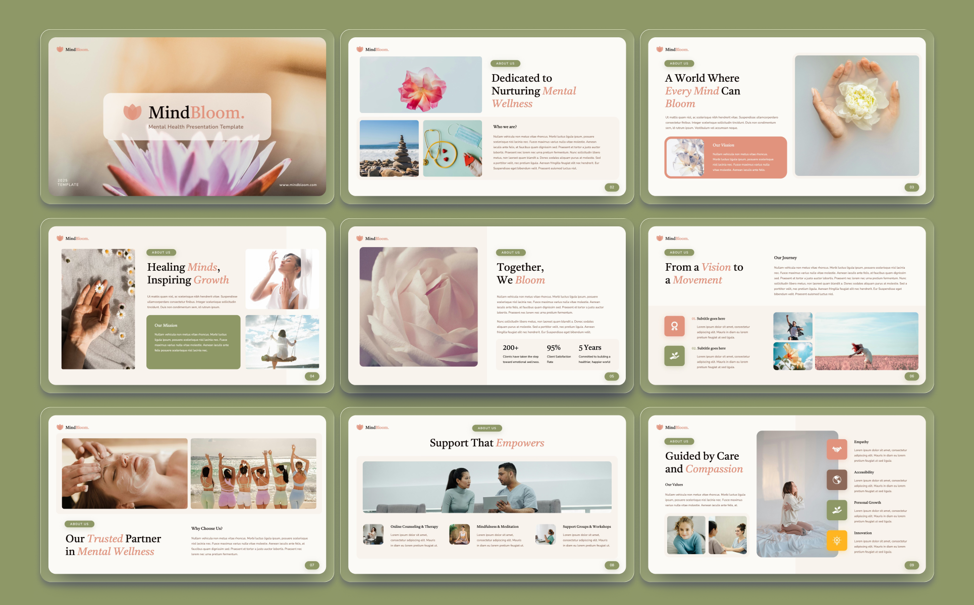 Whether you’re a therapist, counselor, educator, wellness coach, or a mental health organization, MindBloom provides versatile slide designs that communicate professionalism while keeping a compassionate, human touch.