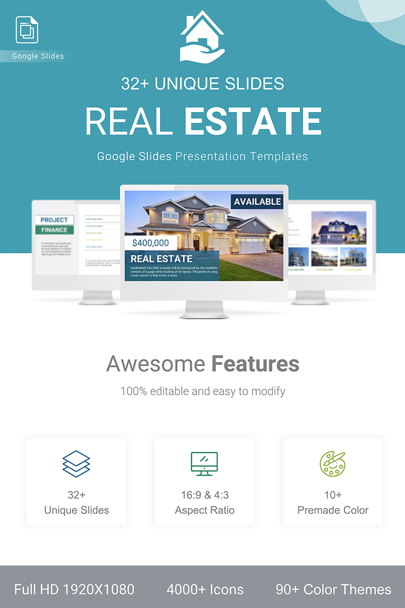 This template might just be the perfect option for you. The drag-and-drop slide designs are waiting for those eye-catching photos of your property. That features a set 32 unique slides that are available in 10 different color schemes and +90 Color Themes, making it a total of 640 slides. and free fonts as well.