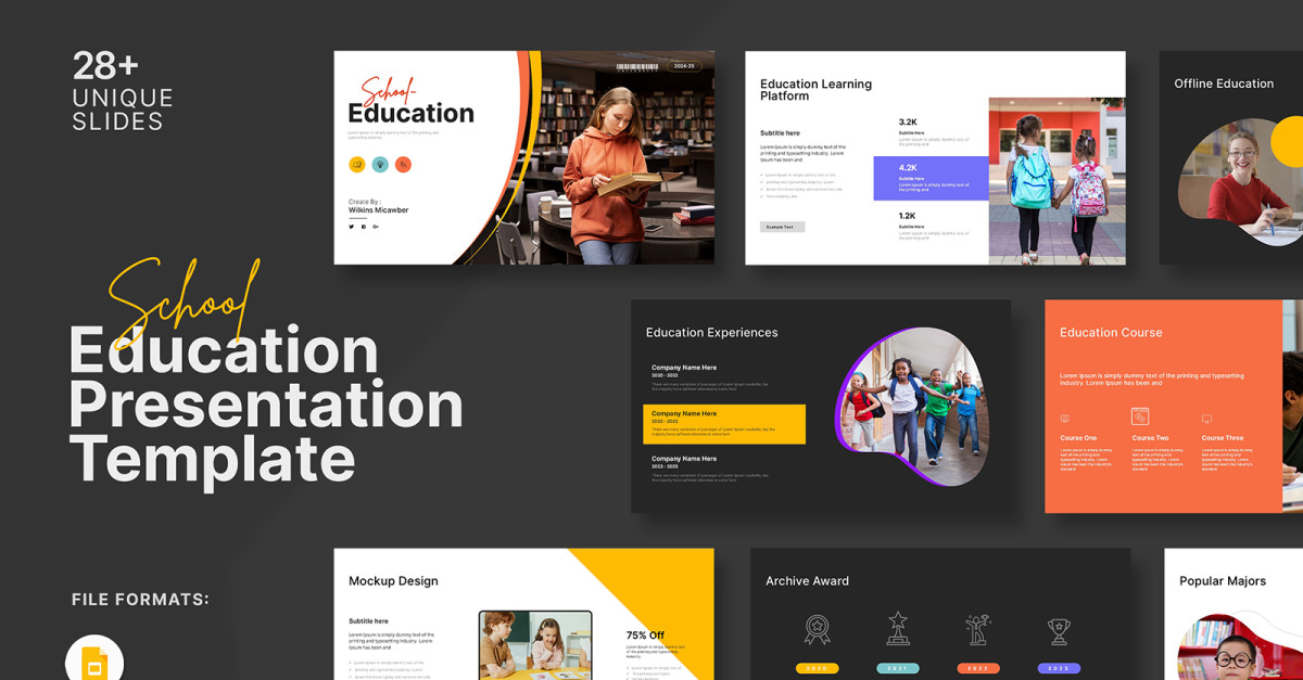 Education Google Slide Presentation template allows you to simply add your logo, and images and edit your brand colors and typography