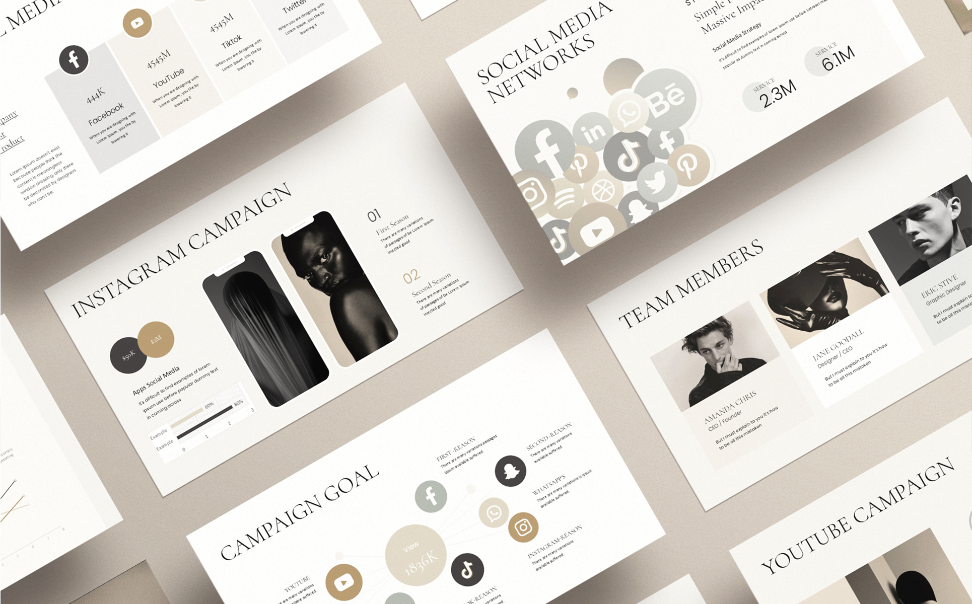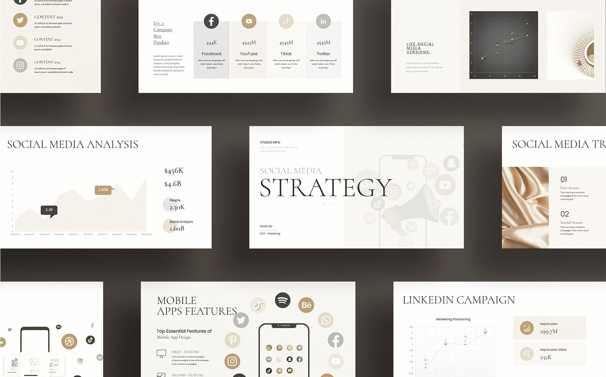 This social media strategy Google Slides template contains 115+ useful slides for social media strategies and processes such as user analysis, market analysis, targeting, social media plan, marketing strategy, content plan, campaign, schedule, marketing KPIs, budget, and many more.
