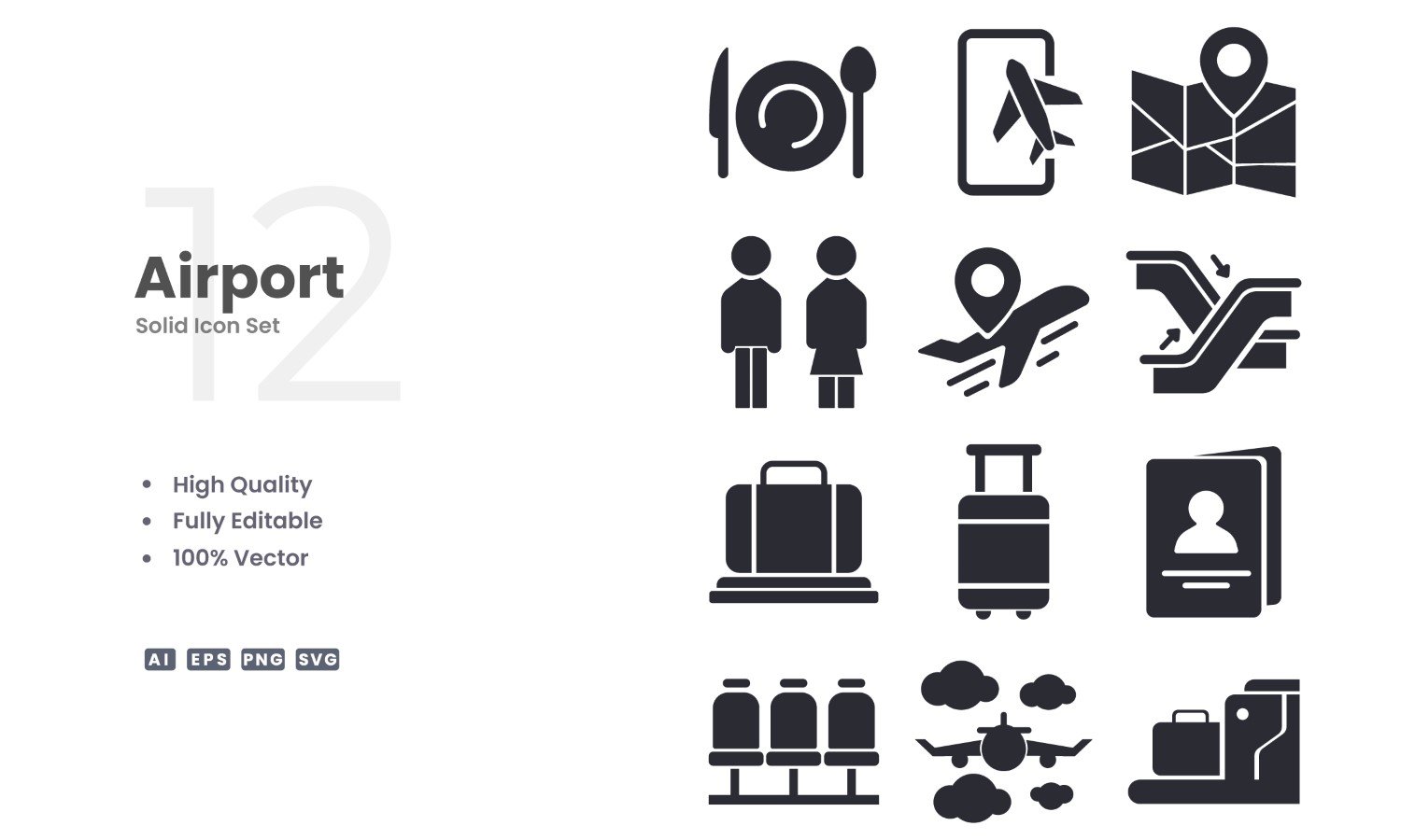Set of 12 Airport solid icons | Simple and clean design, perfect for websites, mobile apps, books, social media, infographics, flyer, print, banners, posters and many more. To resize or change color you can easily edit on vector software like Adobe Illustrator and CorelDRAW.