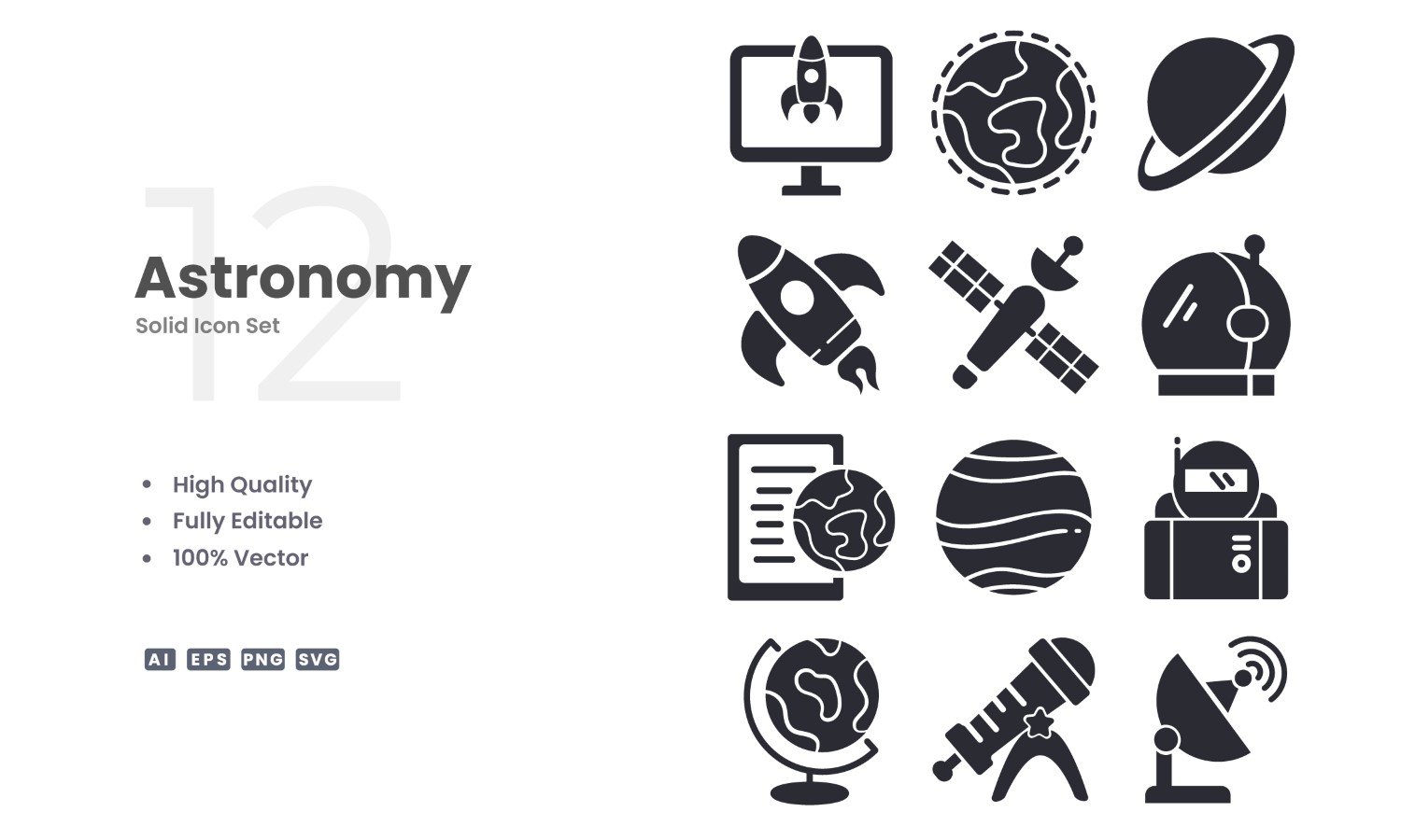 Set of 12 Astronomy solid icons | Simple and clean design, perfect for websites, mobile apps, books, social media, infographics, flyer, print, banners, posters and many more. To resize or change color you can easily edit on vector software like Adobe Illustrator and CorelDRAW.
