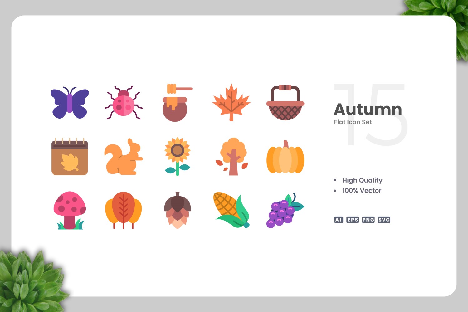 Set of 15 Autumn flat icons | Simple and clean design, perfect for websites, mobile apps, books, social media, infographics, flyer, print, banners, posters and many more. To resize or change color you can easily edit on vector software like Adobe Illustrator and CorelDRAW.