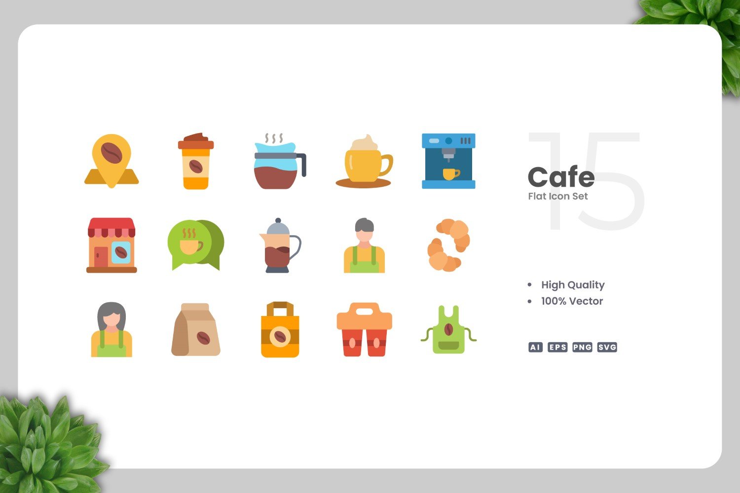 Set of 15 Cafe flat icons | Simple and clean design, perfect for websites, mobile apps, books, social media, infographics, flyer, print, banners, posters and many more. To resize or change color you can easily edit on vector software like Adobe Illustrator and CorelDRAW.