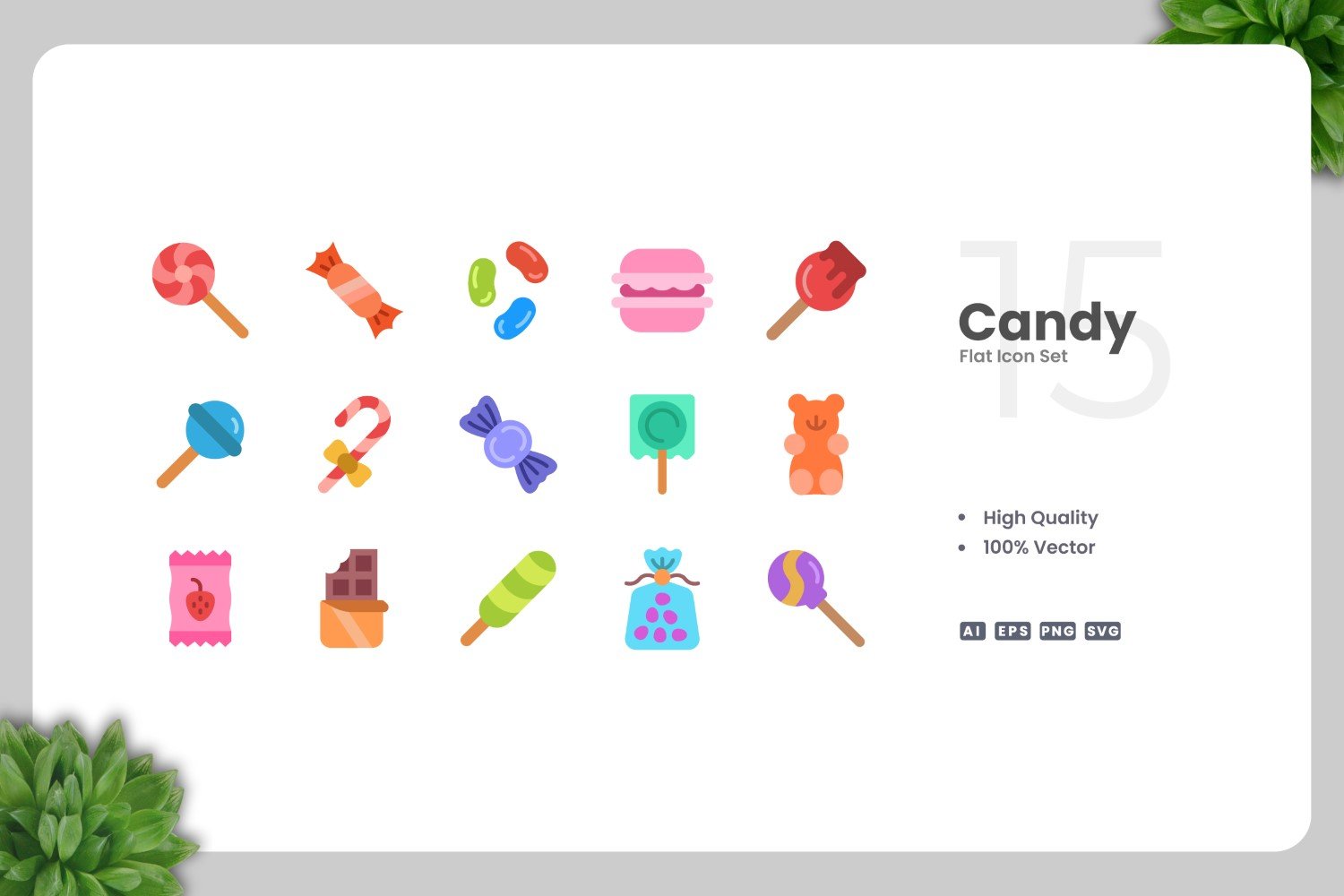 Set of 15 Candy flat icons | Simple and clean design, perfect for websites, mobile apps, books, social media, infographics, flyer, print, banners, posters and many more. To resize or change color you can easily edit on vector software like Adobe Illustrator and CorelDRAW.