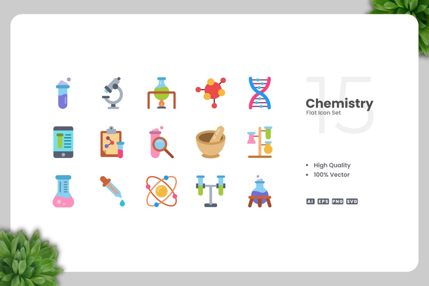 Set of 15 Chemistry flat icons | Simple and clean design, perfect for websites, mobile apps, books, social media, infographics, flyer, print, banners, posters and many more. To resize or change color you can easily edit on vector software like Adobe Illustrator and CorelDRAW.