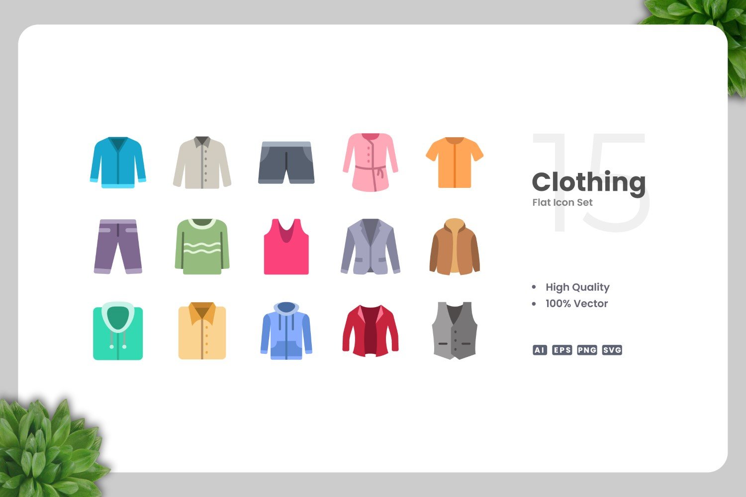 Set of 15 Clothing flat icons | Simple and clean design, perfect for websites, mobile apps, books, social media, infographics, flyer, print, banners, posters and many more. To resize or change color you can easily edit on vector software like Adobe Illustrator and CorelDRAW.