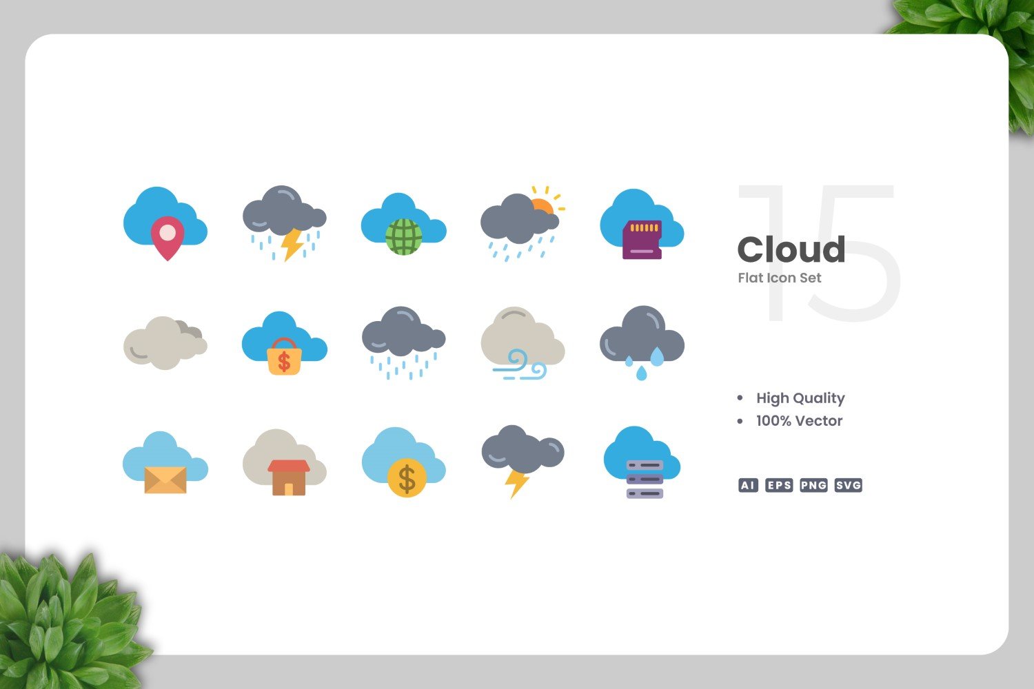 Set of 15 Cloud flat icons | Simple and clean design, perfect for websites, mobile apps, books, social media, infographics, flyer, print, banners, posters and many more. To resize or change color you can easily edit on vector software like Adobe Illustrator and CorelDRAW.