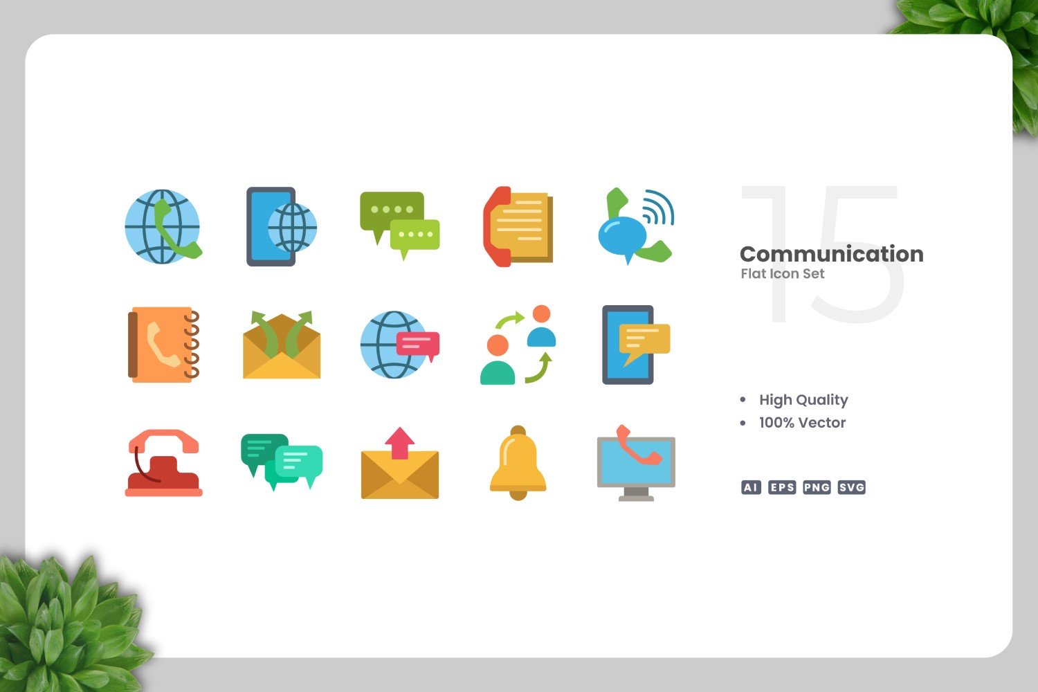 Set of 15 Communication flat icons | Simple and clean design, perfect for websites, mobile apps, books, social media, infographics, flyer, print, banners, posters and many more. To resize or change color you can easily edit on vector software like Adobe Illustrator and CorelDRAW.